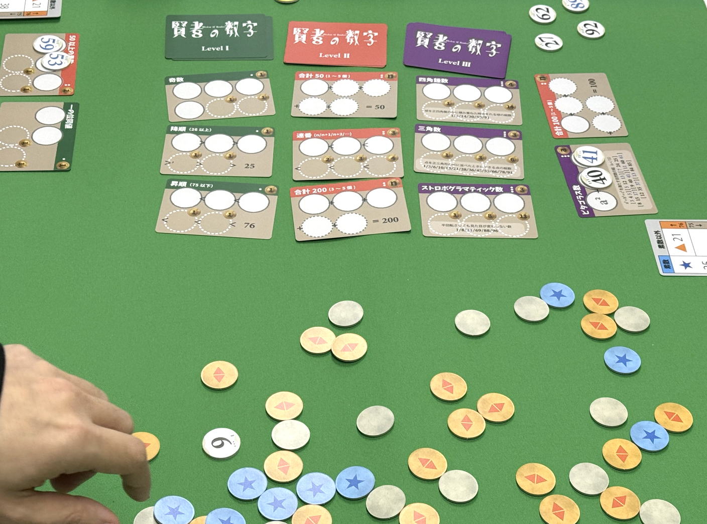 目標を3つ達成したらゲームの終了トリガーが引かれて、最終的に得点を競い合うんだけど、置いてある数字チップを取る際に、自分の手持ちの数字チップを1枚場に出して消費し、新たな数字チップをめくったり取ったりするというシステムがユニークだと思いました。