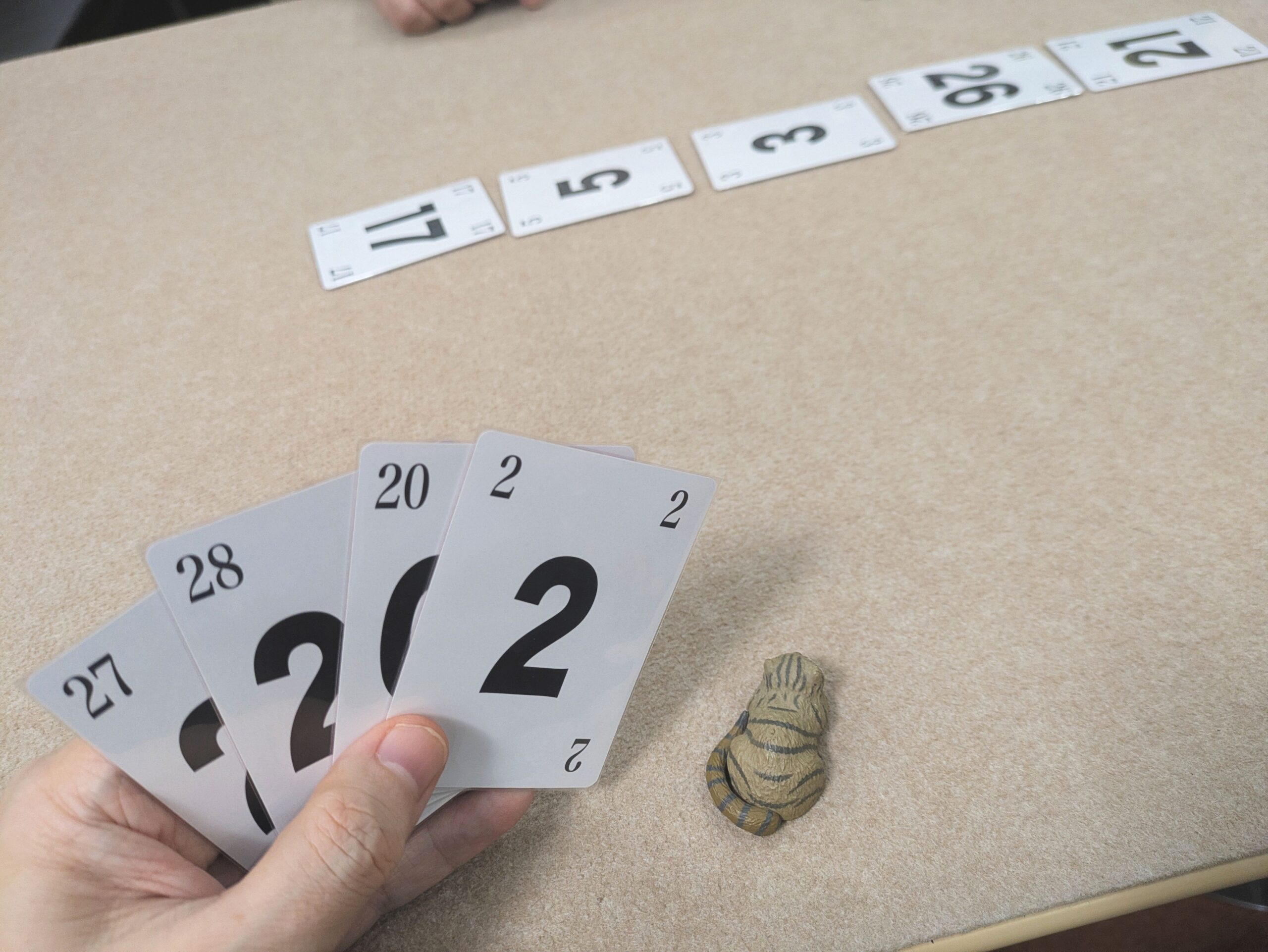 アン:1~32の数字のユニークカードを使う手札出し切りのシンプルなゴーアウト。数字のカードはすべて1枚ずつなので、複数枚出せるのは連番のシーケンス(階段)だけです。このゲームはひねってある部分がふたつあって、まずは数字がループしているということ。カードを出す際は場に出ているカードの数字より高いものを出さなければいけないのですが、32が最強ではなく、32の次に強い数字は1に戻り、そこから2、3……と続いていきます。