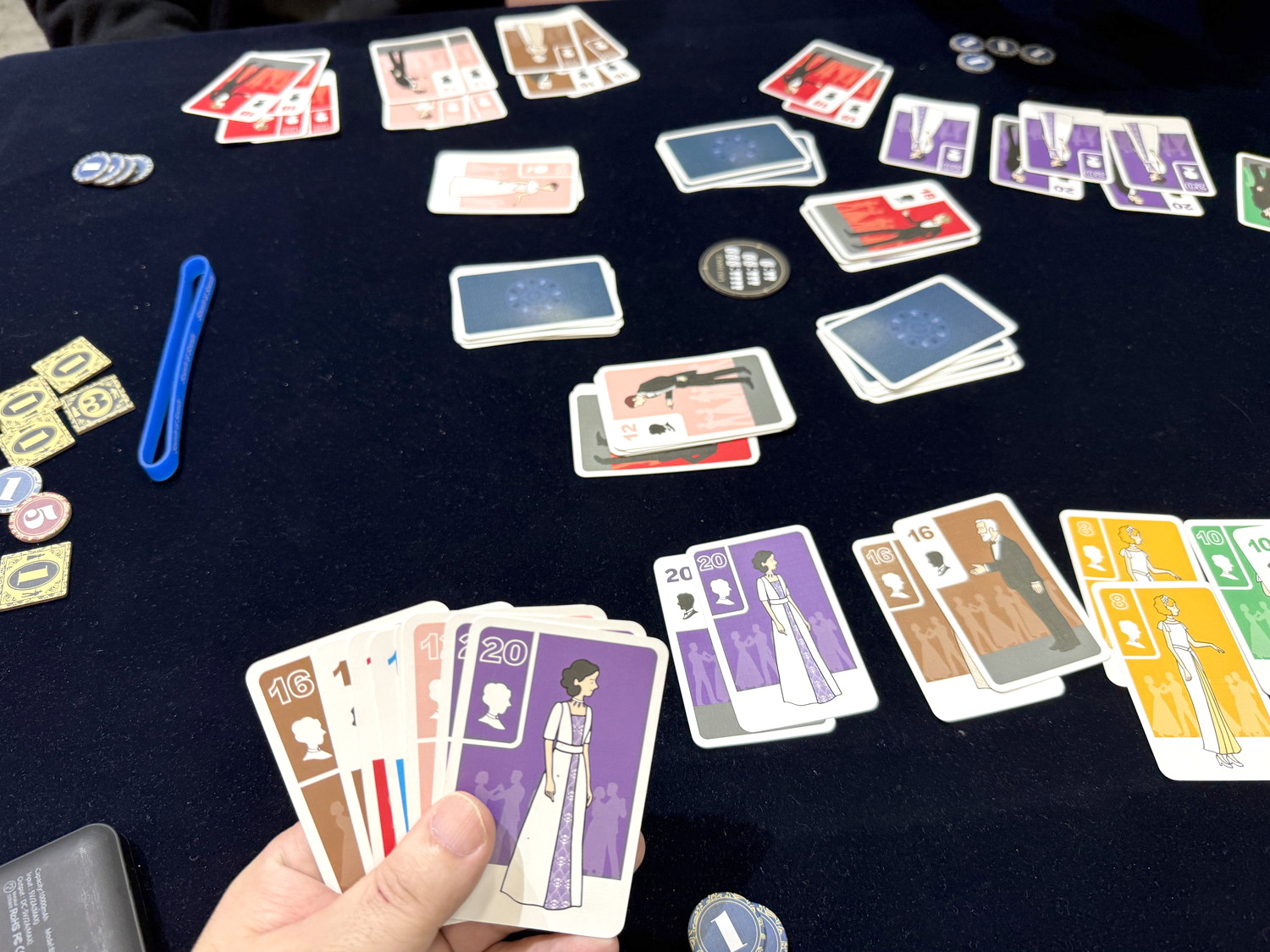 アン:取られる側は得点がもらえるものの、ペアができたほうがさらに高い得点が獲得できる可能性があるわけか。自分も会場の試遊の様子を見たのですが、プレイヤーのひとりが「シャル・ウィ・ダンス?」と言って他プレイヤーのカードを取っていました。あれが浮いているカードを横取りするアクションだったんですね。決めセリフのようで面白かったし、盛り上がりそう。