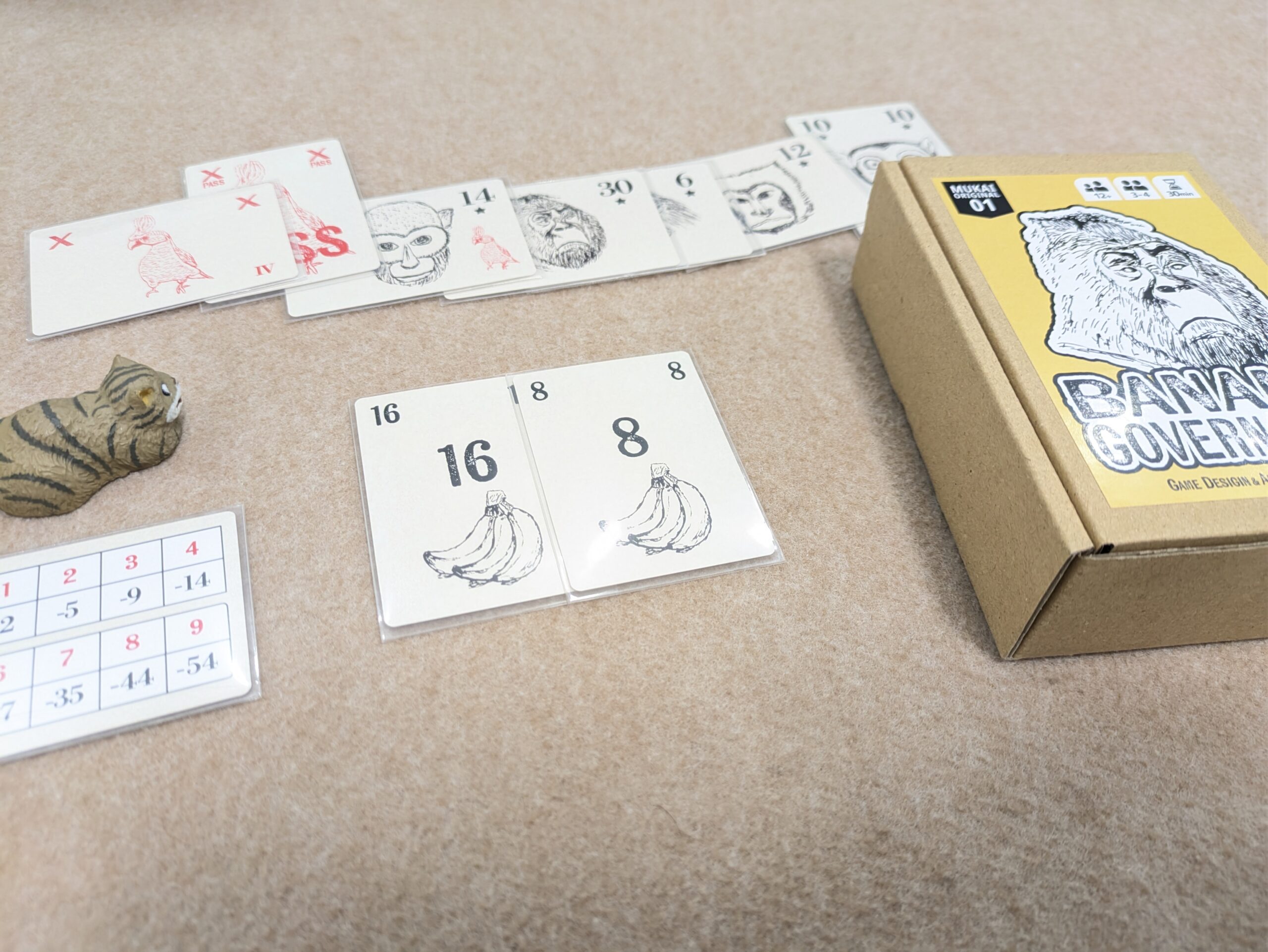 アン:ジャンルとしては競りゲーム。まず入れ替え禁止の手札に仕切り札を差し込んで4分割、それを次のプレイヤーに渡し、ドラフトしてひとブロックずつを取っていきます。これを4回繰り返して手札を作ります。次に競り。全5ラウンドあり、場に出たサルを手札のバナナのカードを使って落札していきます。