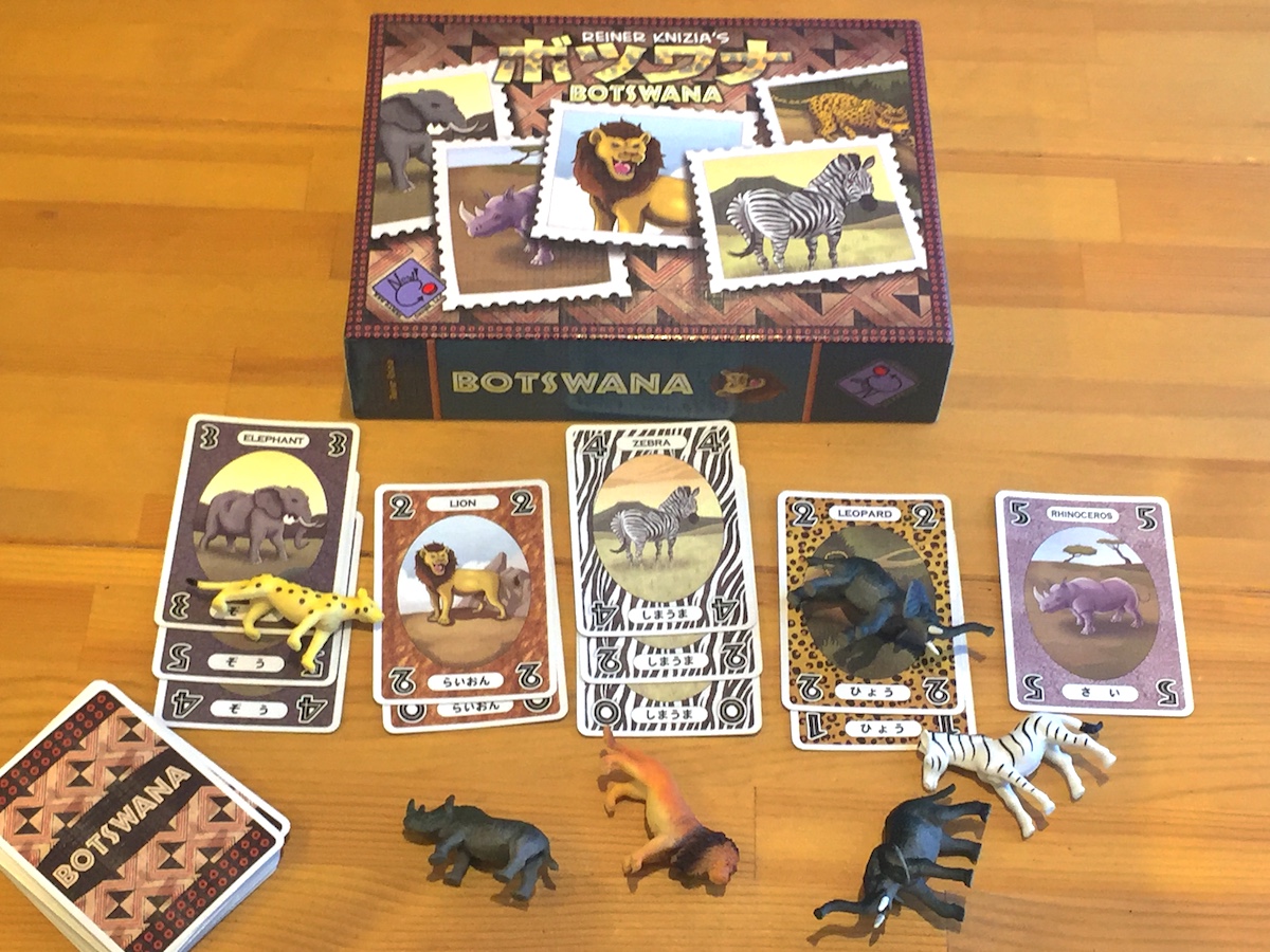 動物を集めてポイントを得ていくゲーム。プレイヤーは手番に動物のカードを1枚出し、その動物のコマをひとつ獲得します。動物は5種類おり、カードはそれぞれ0から5の数字が書かれています。