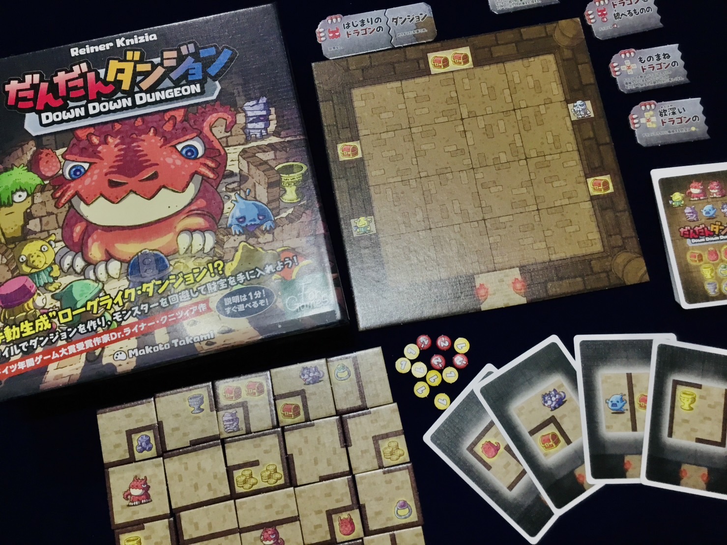 2016年発売の『Mysterious Dungeons』の日本語版。だんだん出来ていくダンジョンを踏破するタイル配置ゲームです。