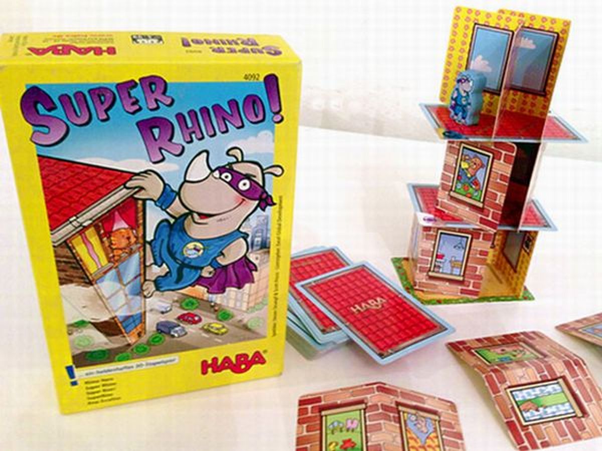 高いところから悪を見張る正義のヒーロー、キャンプテン・リノのために塔を作り上げるバランスゲーム。対応人数は2~5人。プレイヤーは手番に手札から壁カードもしくは屋根カードを出し、これを積み上げて塔を作っていきます。屋根カードにリノが描かれている場合は、そこにリノのコマを置かなければなりません。最初に手札が無くなった人が勝者となります。