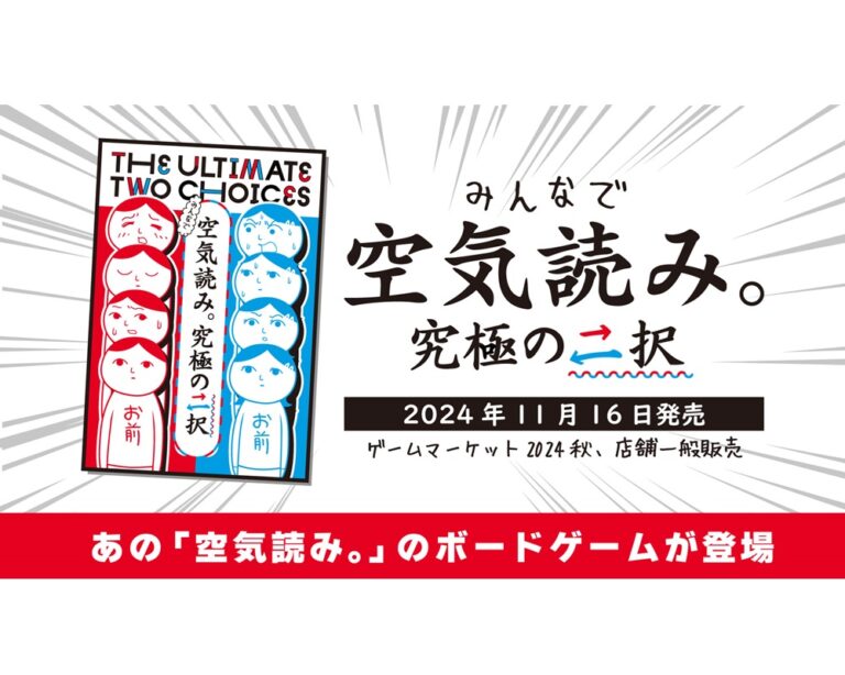 株式会社ジー・モードは、デジタルゲーム『空気読み。』を題材としたボードゲーム『みんなで空気読み。究極の二択』を共同開発した。同作は11月16日に発売される。価格は2,200円(税込み・希望小売価格)。 二択問題が記載され … 続きを読む 『みんなで空気読み。究極の二択』累計100万本突破の人気デジタルゲームシリーズをボードゲーム化!