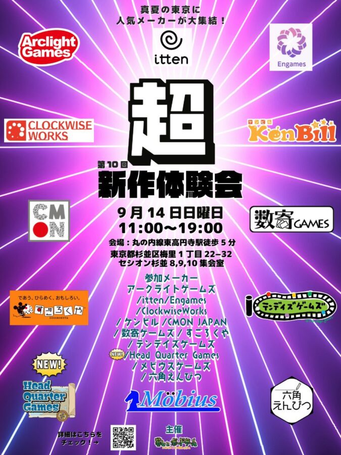 人気メーカーの発売前&発売したばかりの新作ボードゲームをまとめて体験できる新作ボードゲーム体験会です。ゲームの魅力を知り尽くしたスペシャリスト(メーカーの人達)から、そのゲームならではのシステムや表現、制作の裏話などを聞きながらたっぷりと遊びましょう。今回は丸の内線 東高円寺駅徒歩5分の会場になります。参加メーカー、遊べるゲーム等は決まり次第お伝えします!