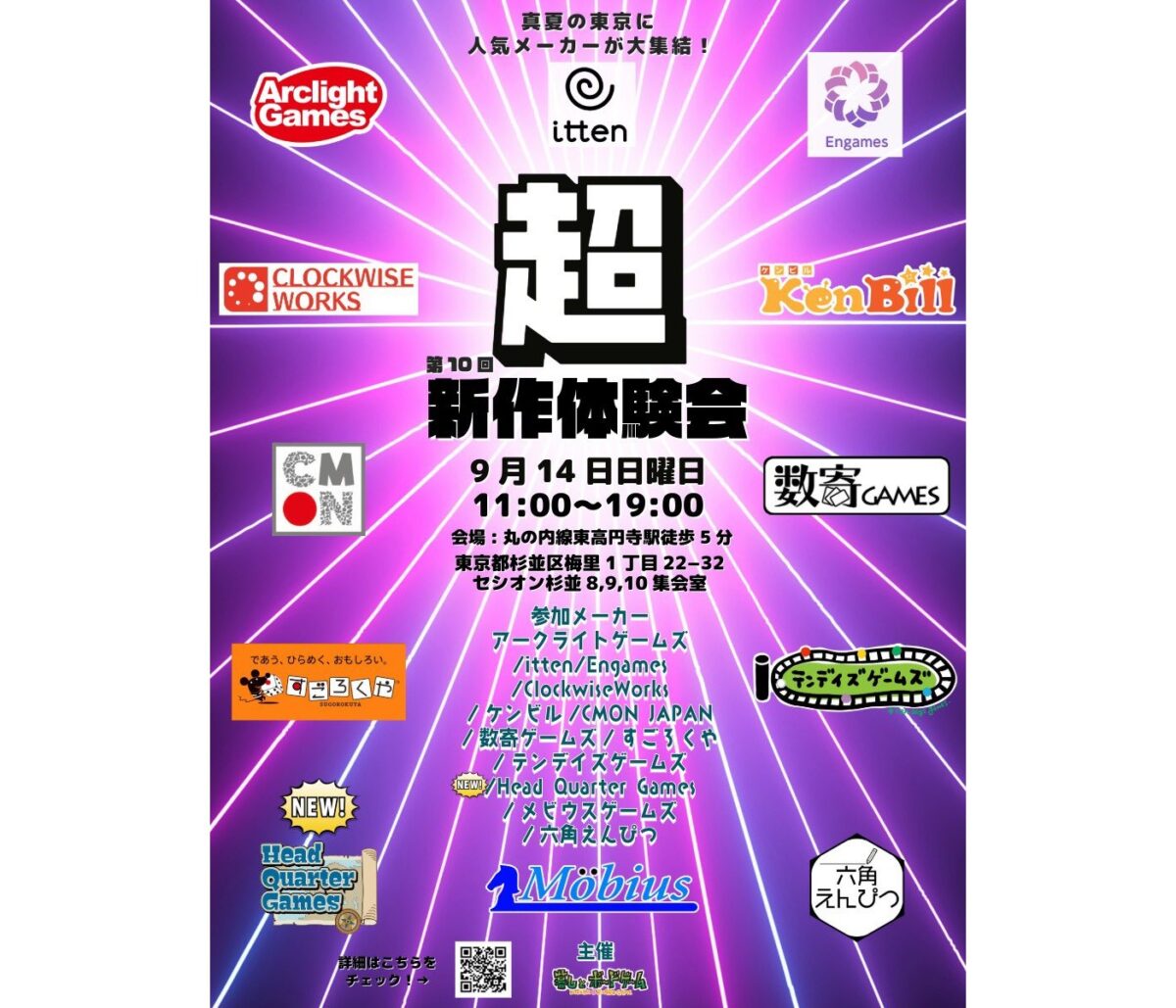 超新作体験会は、メーカー・パブリッシャー各社の新作を事前にプレイできる体験会で、参加登録およびチケットの販売はボードゲームベアのサイトにて受付中。9月1日18時の時点で登録者が50名を超えていたため、参加を希望する人は急ぎの予約をしておきたい。