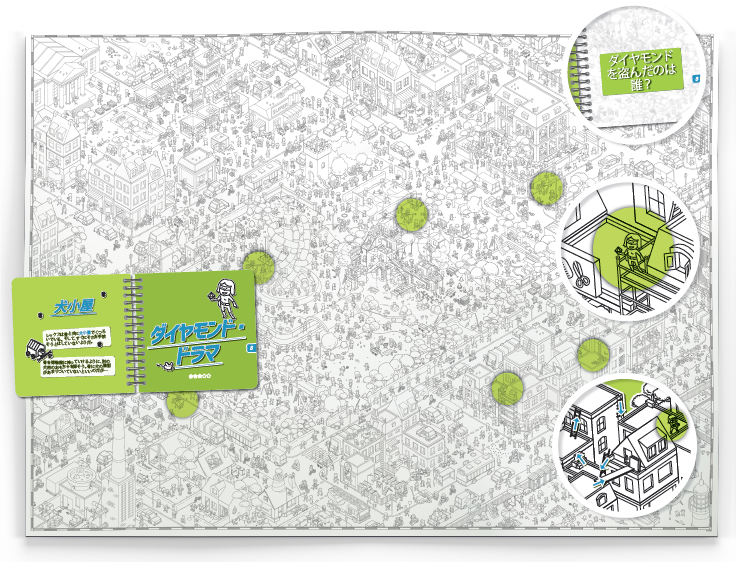 『ミクロマクロ:クライムシティ』シリーズは、建物や人物が細密に書き込まれた地図のなかから犯行現場、被害者、犯人、動機などを探し出して事件を解決する新感覚の協力ゲーム。