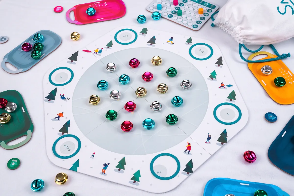 ボード上にビー玉を転がして、他の人のビー玉を落として得点を稼ぐアクションゲーム。