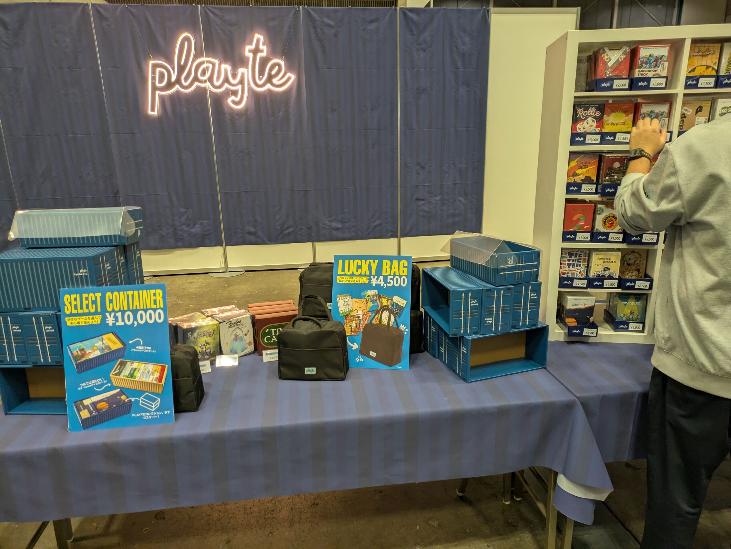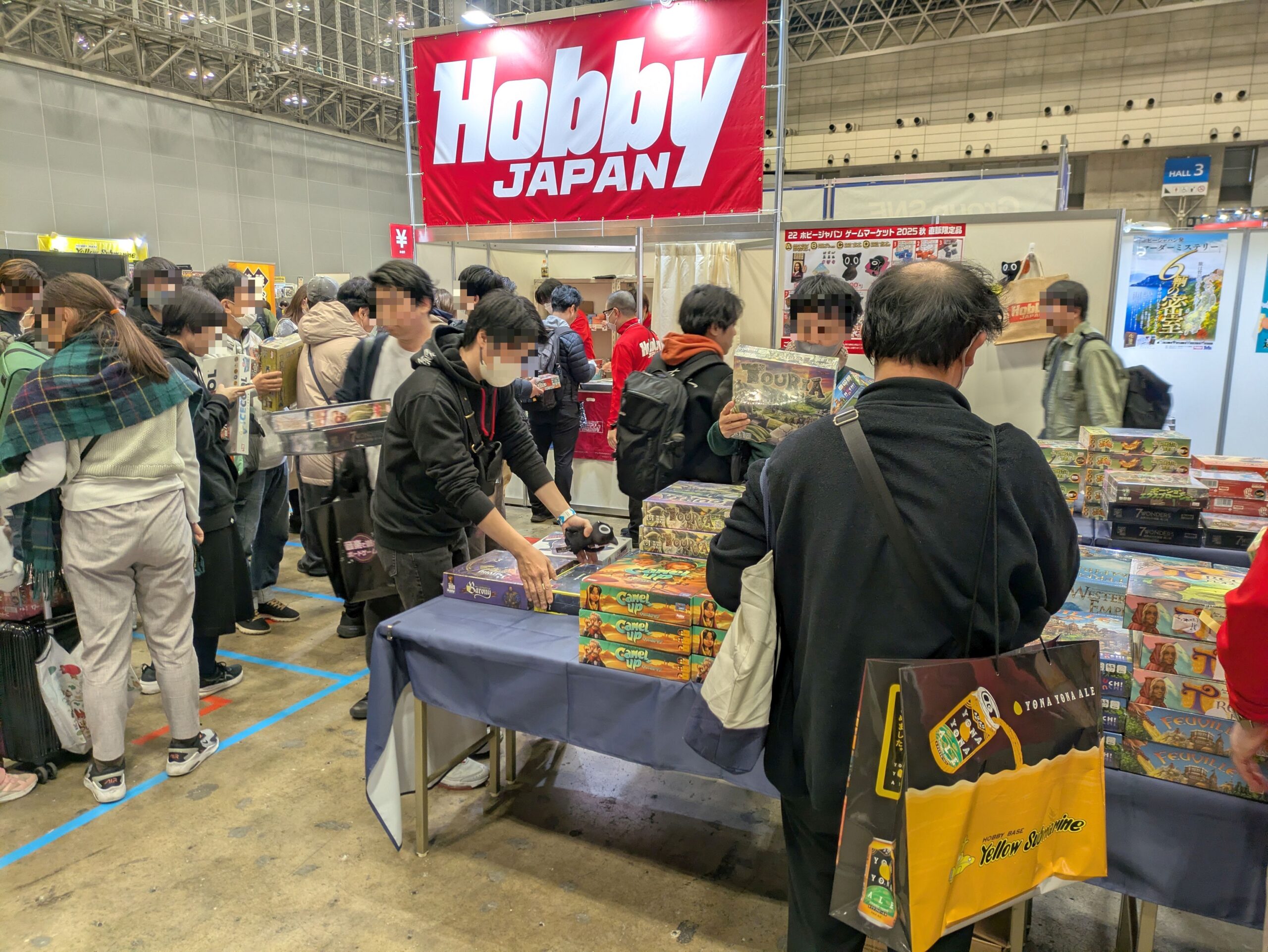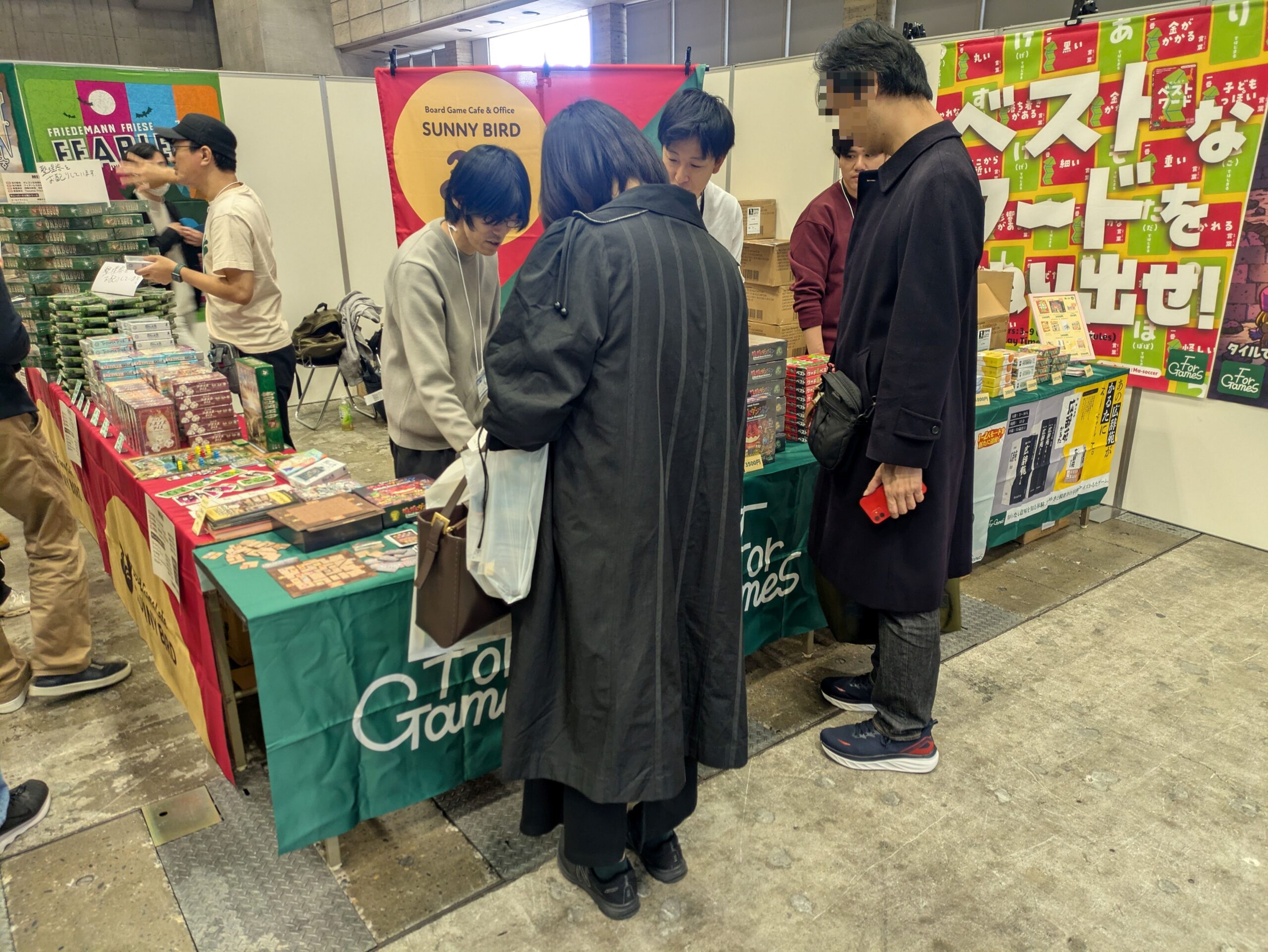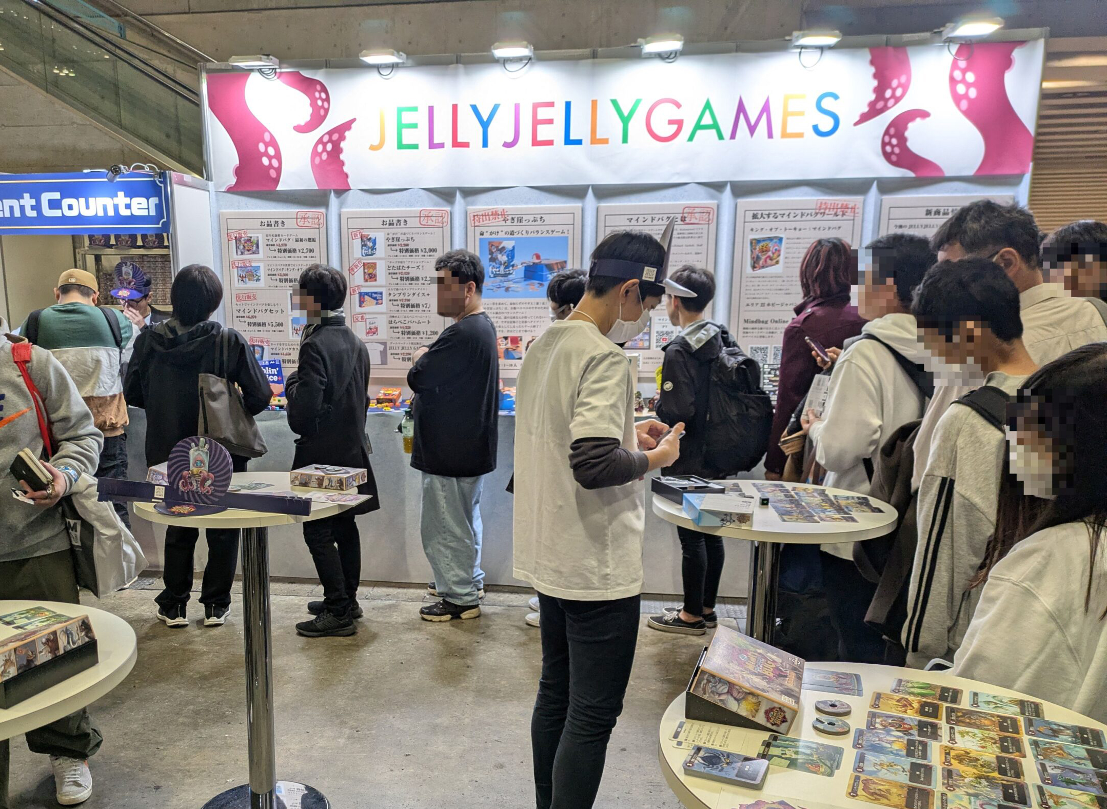 11月14日に発売された『HITSTER』を個数限定で販売。音楽を聴いてタイムラインに並べる新機軸のタイトルで、ジーピーブースでは10曲だけ楽しめる体験版が配布されたが、大変な人気でこちらも品切れに。ブース内にDJスペースを模した試遊エリアを設置し、ビッグサイズのカードを使用した同作の試遊も大盛況。次々と流れる有名J-POPの名曲に足を止める客も多く見受けられた。また、連結することで何人でもプレイできる『カタンコネクト』の限定販売と試遊も行われ、注目を集めていた。