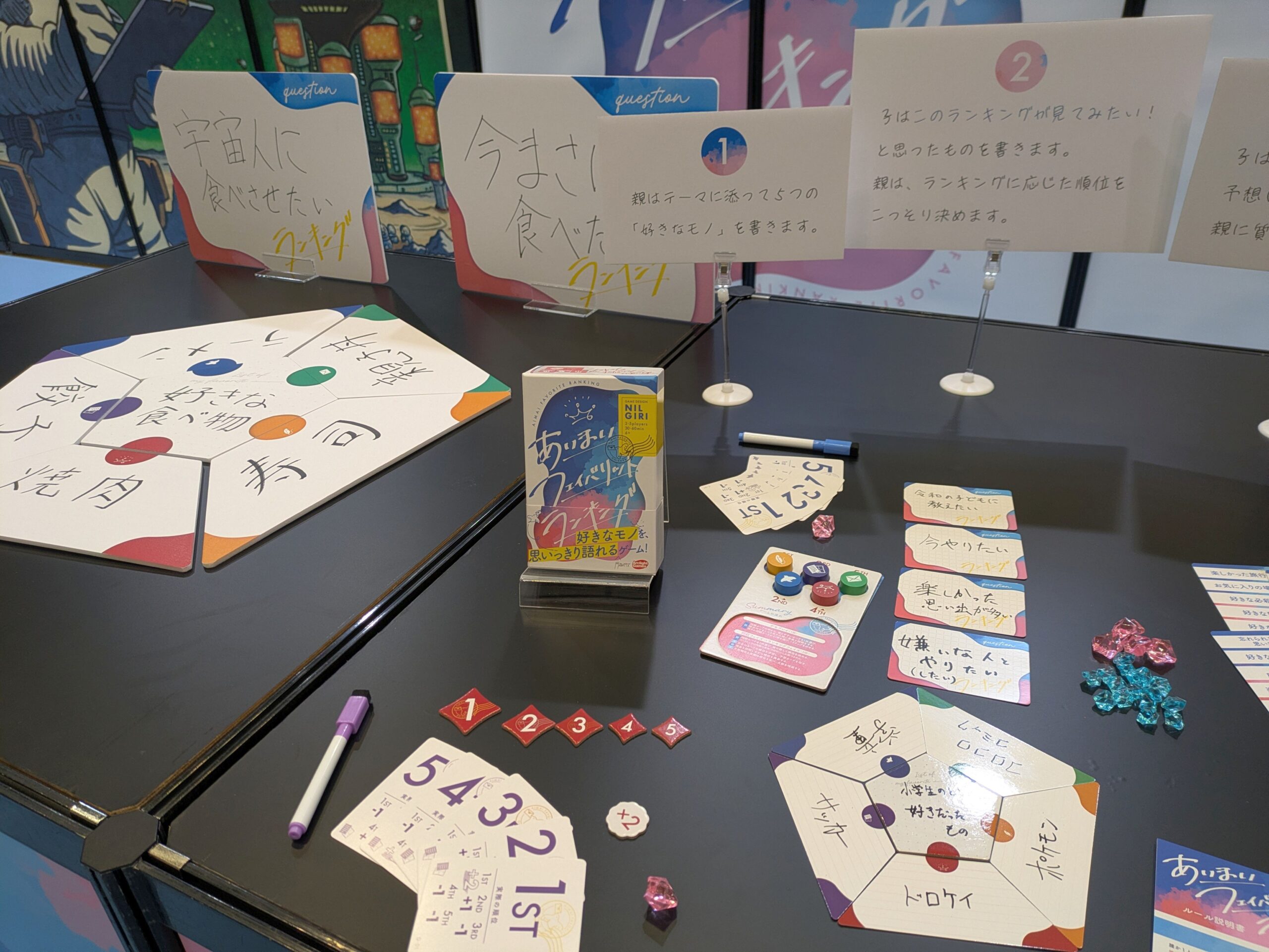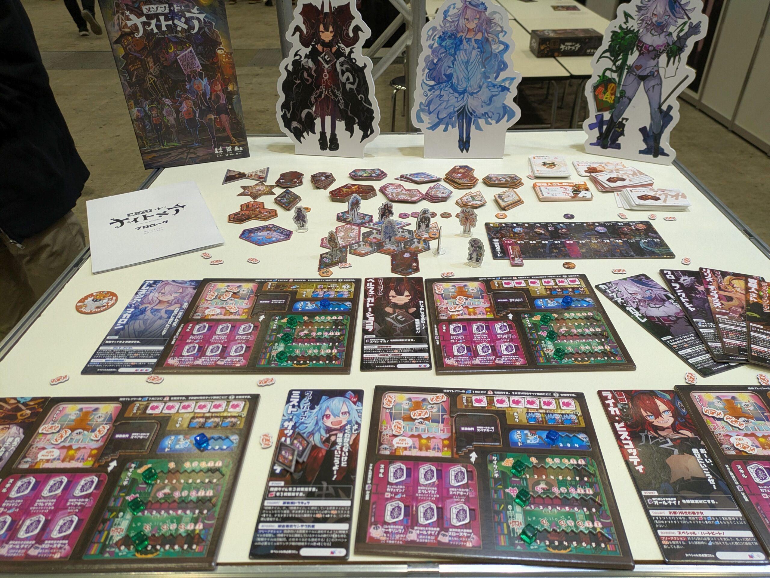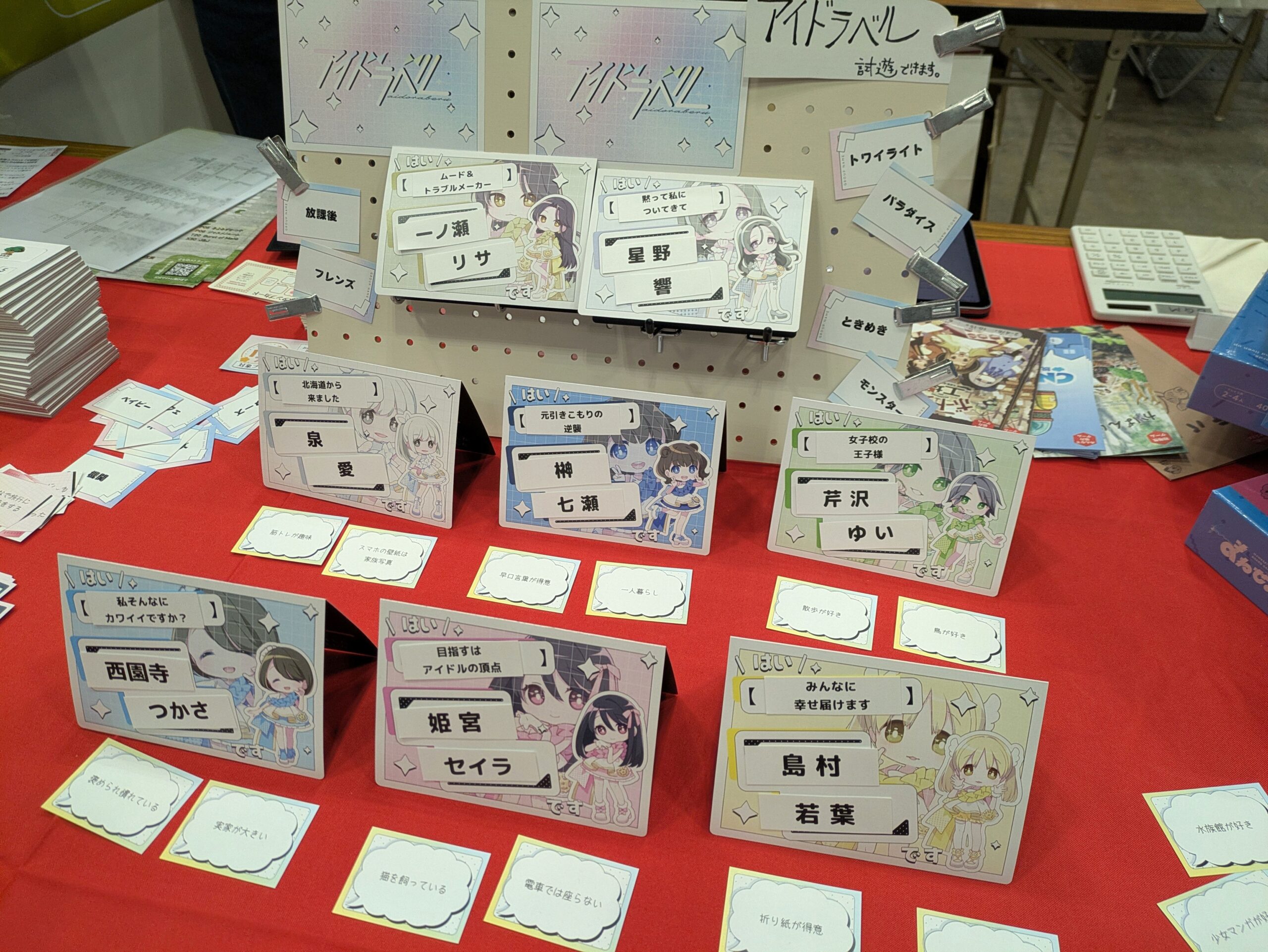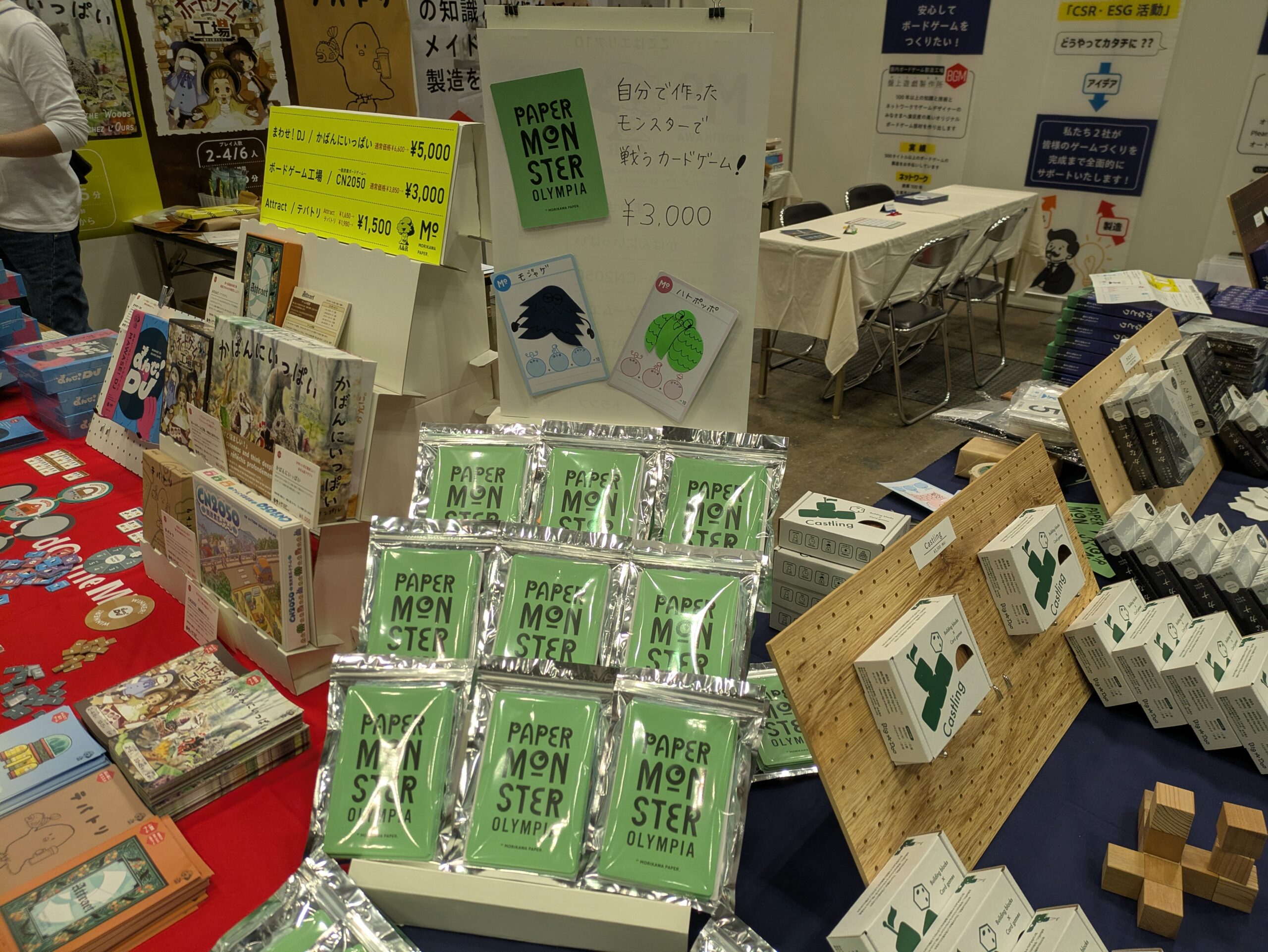)Dig-A-Dooは自分で想像したモンスターを戦わせる新作カードゲーム『PAPER MONSTER』を販売。盤上遊戯製作所はA&R GAMES新作『アイドラベル』の試遊を行った(ゲームデザインは上杉真人氏&パーティ太郎氏)。アイドルグループの新加入メンバーをオーディション番組の視聴者となって見届けるタイトルで、販売は次回を予定している。