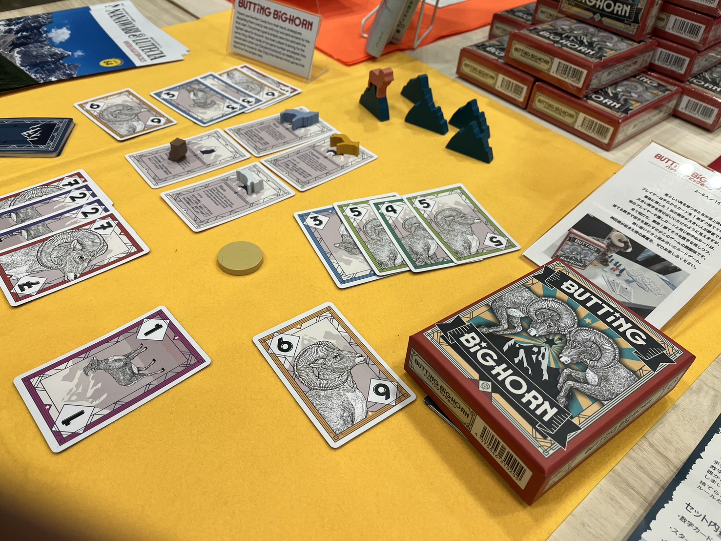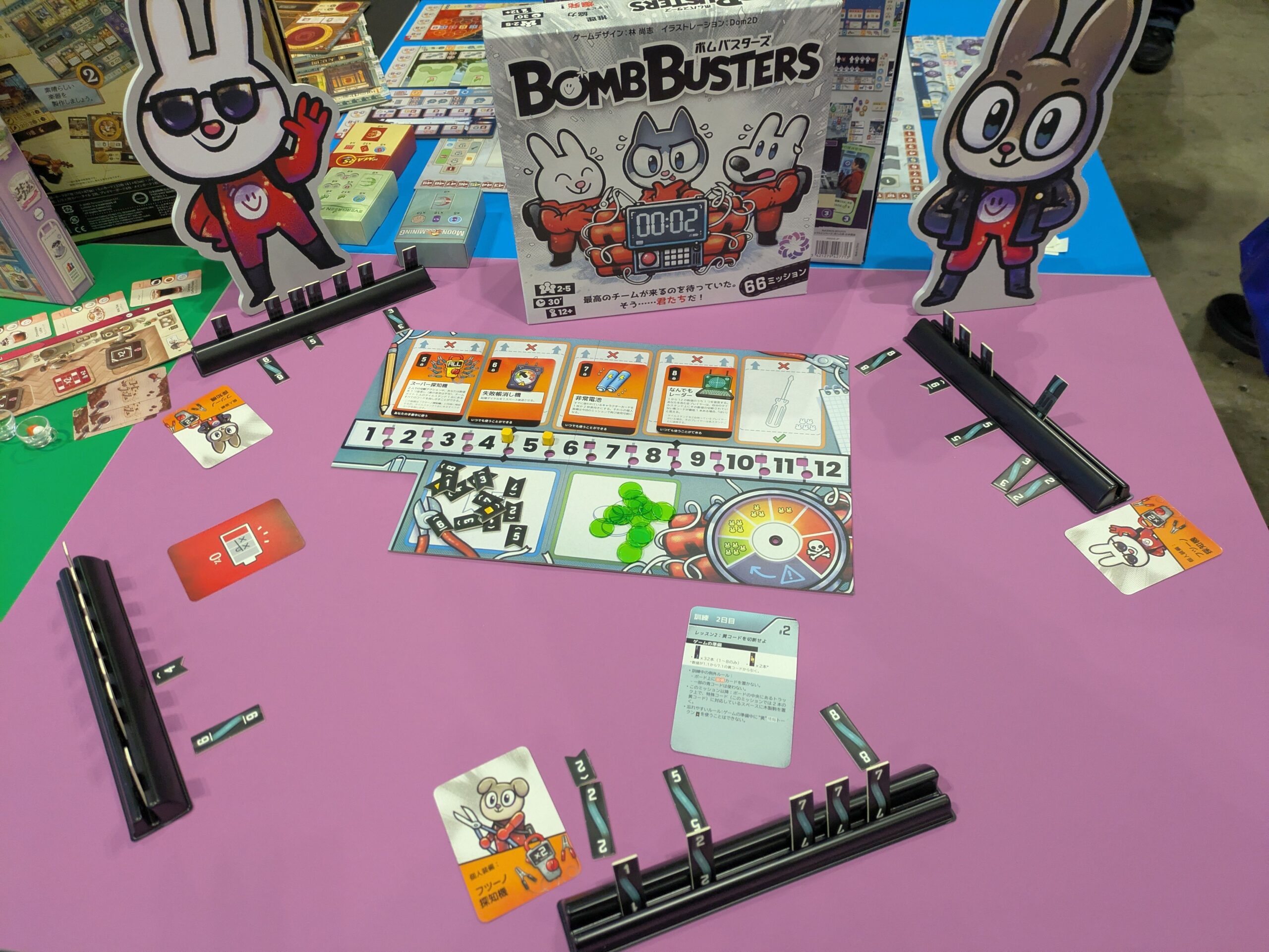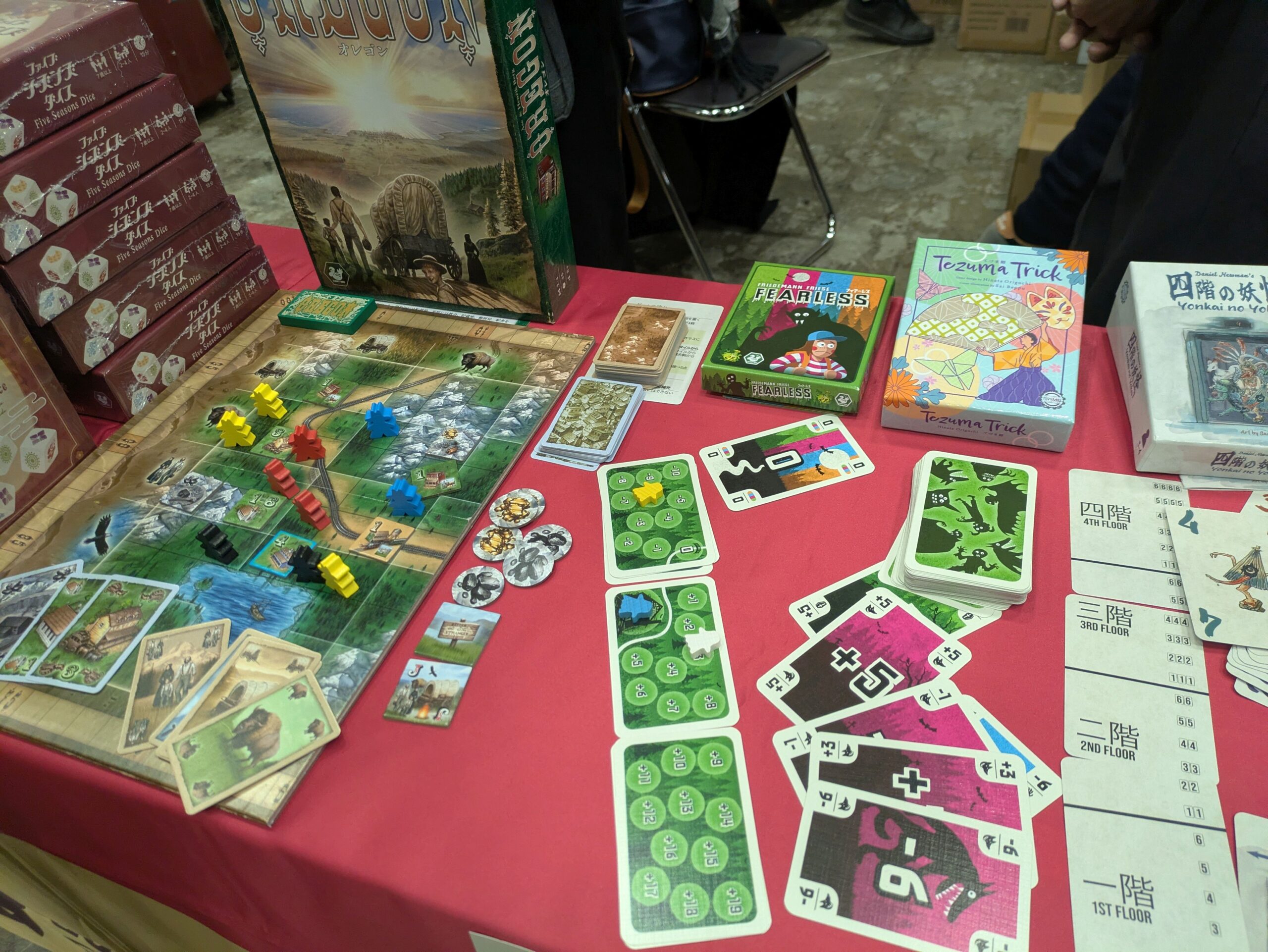 富山のEngamesは長大な列ができた。久しく品切れとなっていたドイツ年間ゲーム大賞2025受賞作の『ボムバスターズ』が待望の再販、さらに話題作の『ゴーストリフト』と『フリップセブン』、大作『ルシアー』『シャクルトンベース』、そして超大作の重量級『トリッケリオン』が先行発売と、怒涛のラインナップを展開。行列は午後になっても長く続いていた。ブースでは『ボムバスターズ』のデザイナーである林尚志氏のサイン会も行われた。