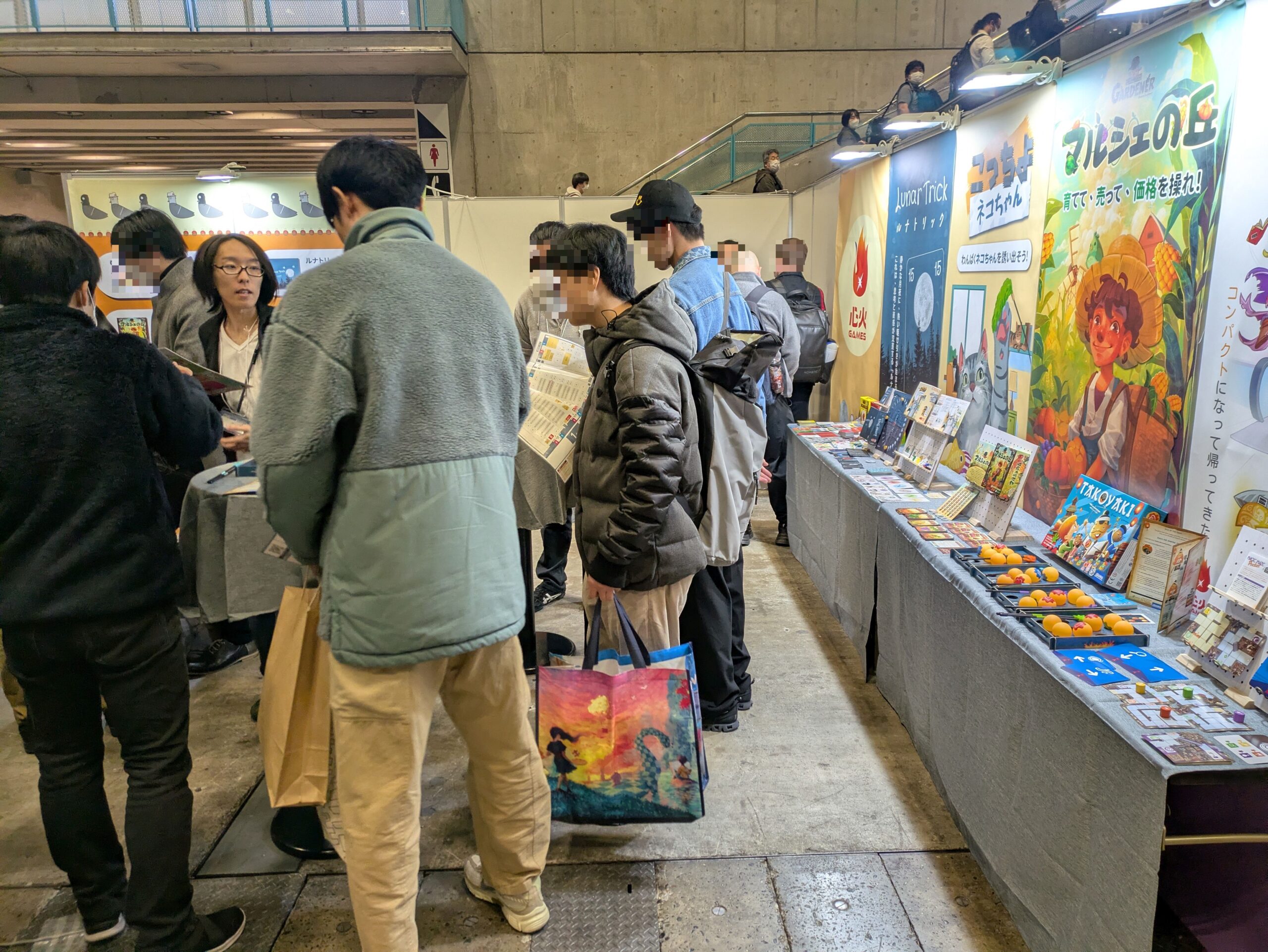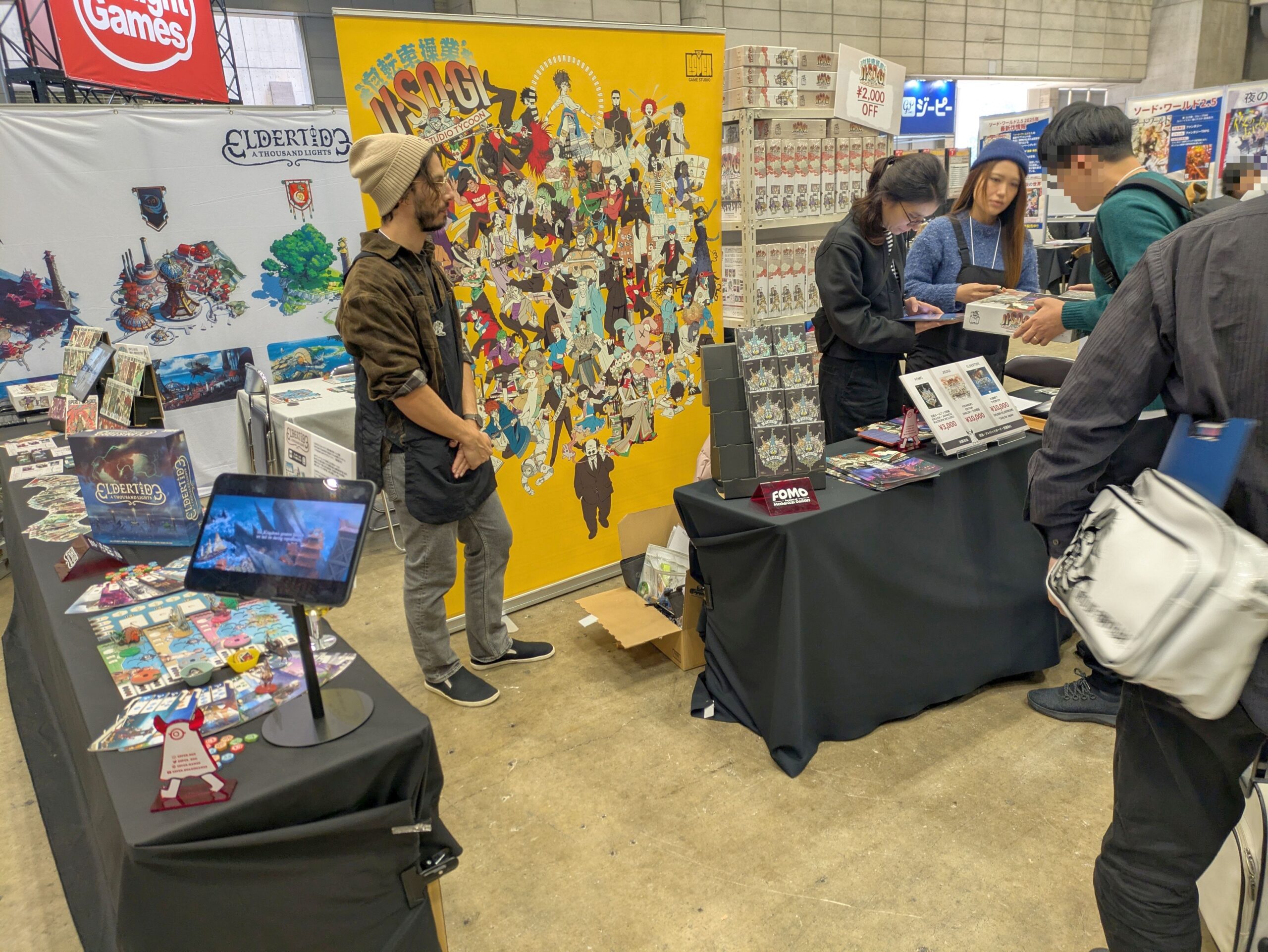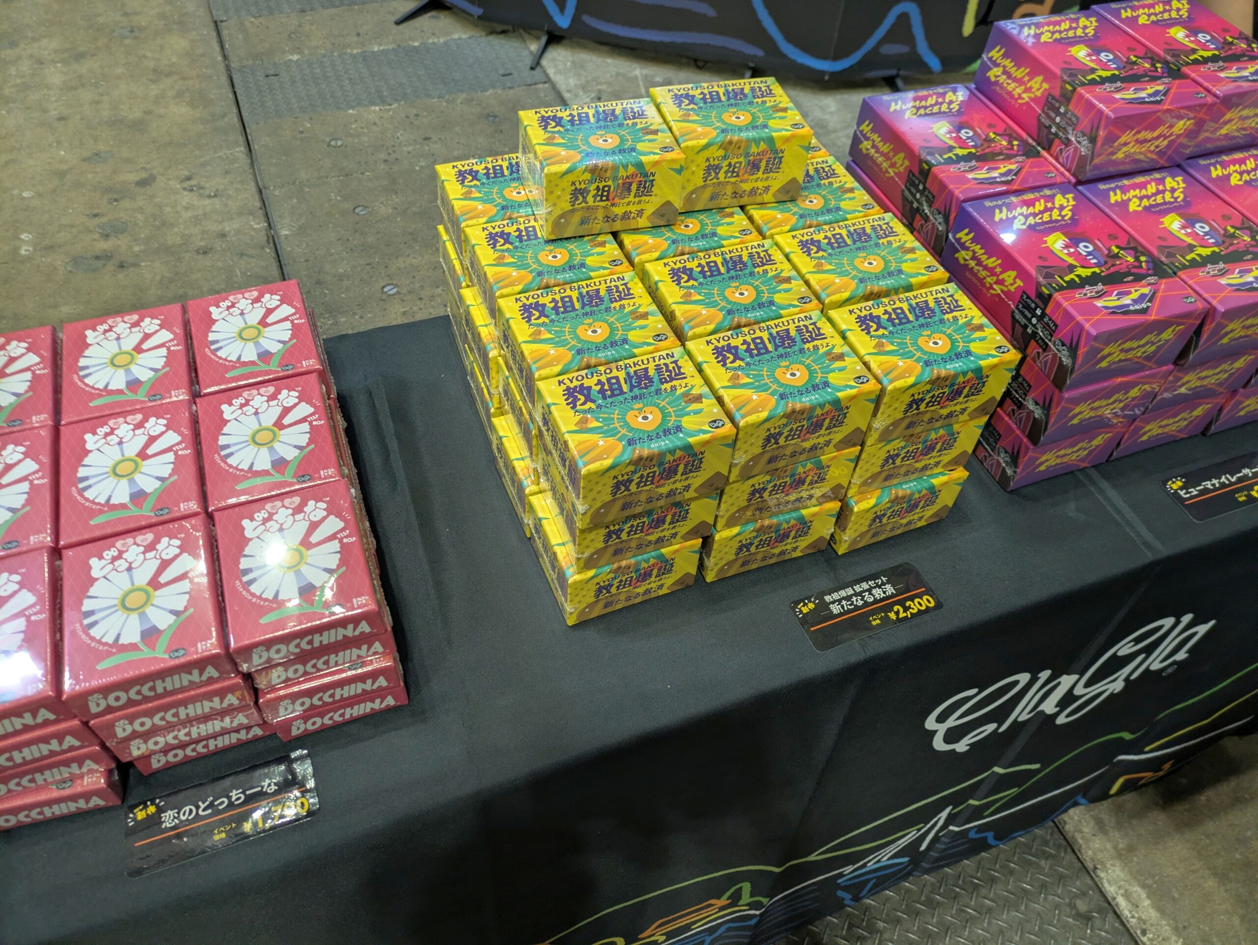 富山のEngamesは長大な列ができた。久しく品切れとなっていたドイツ年間ゲーム大賞2025受賞作の『ボムバスターズ』が待望の再販、さらに話題作の『ゴーストリフト』と『フリップセブン』、大作『ルシアー』『シャクルトンベース』、そして超大作の重量級『トリッケリオン』が先行発売と、怒涛のラインナップを展開。行列は午後になっても長く続いていた。ブースでは『ボムバスターズ』のデザイナーである林尚志氏のサイン会も行われた。