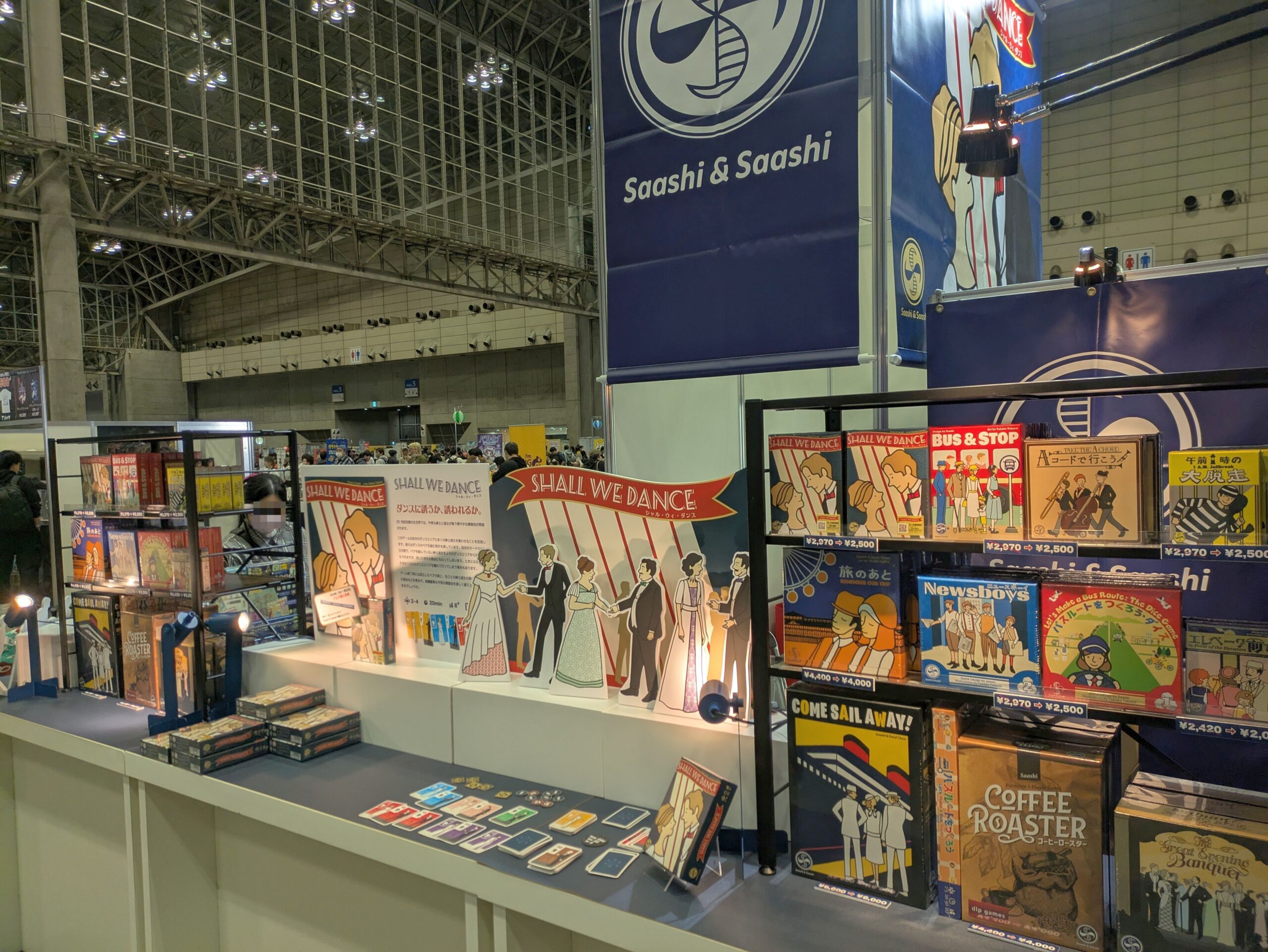 おしゃれなゲームを送り出してきたSaashi&Saashiはブースもスタイリッシュ。ダンスの相手をマッチングする新作カードゲーム『シャル・ウィ・ダンス』をリリースした。