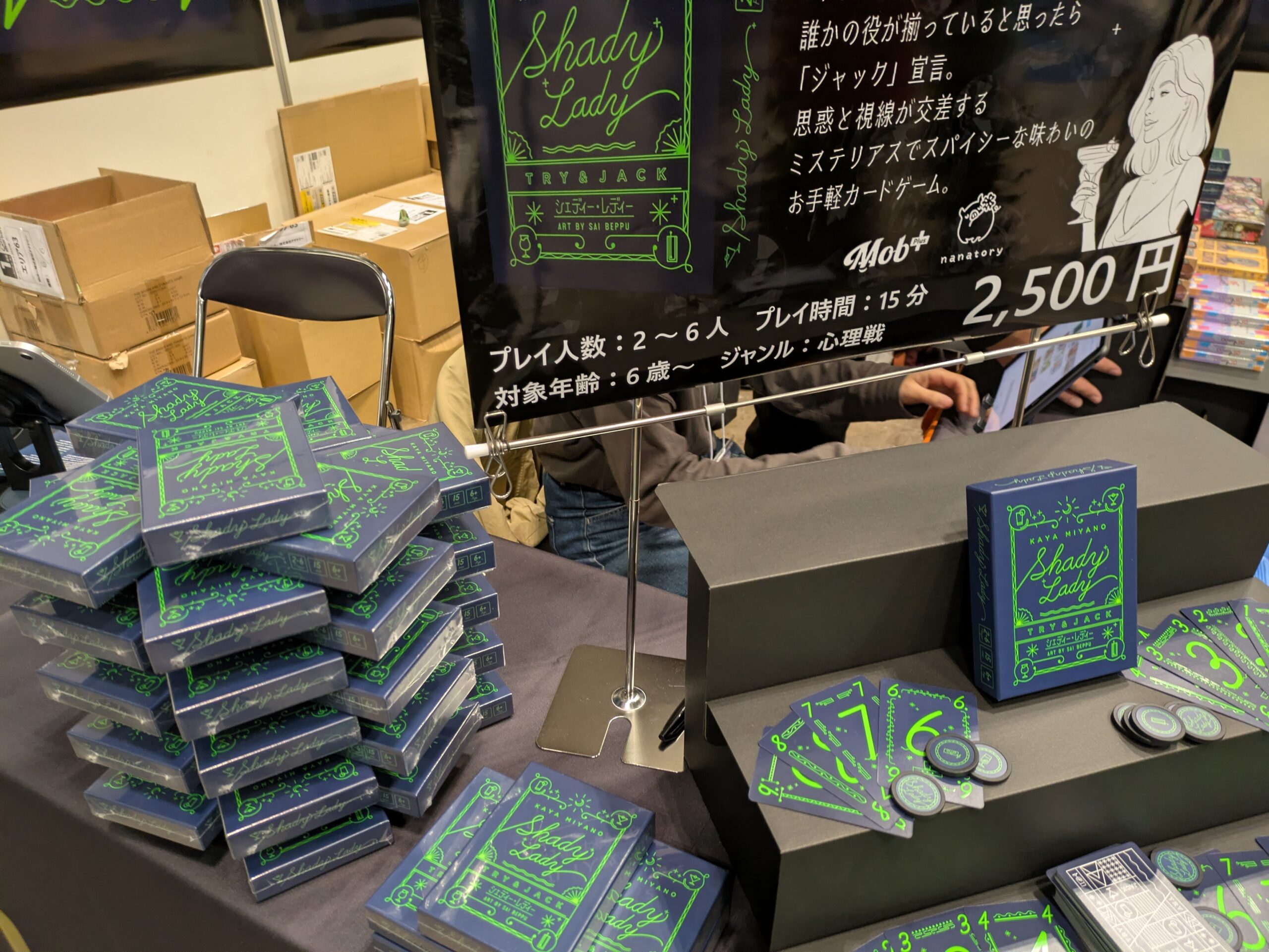 2024年フランス年間ゲーム大賞受賞作『トリオ』(日本版名『ナナ』)のデザイナー宮野華也氏が、株式会社ナナトリーを設立。今回からブランドMob+と合同でのゲームマーケット出展となる。新作として、手札3枚で役を作るカードゲーム『シェディー・レディー』を販売した。