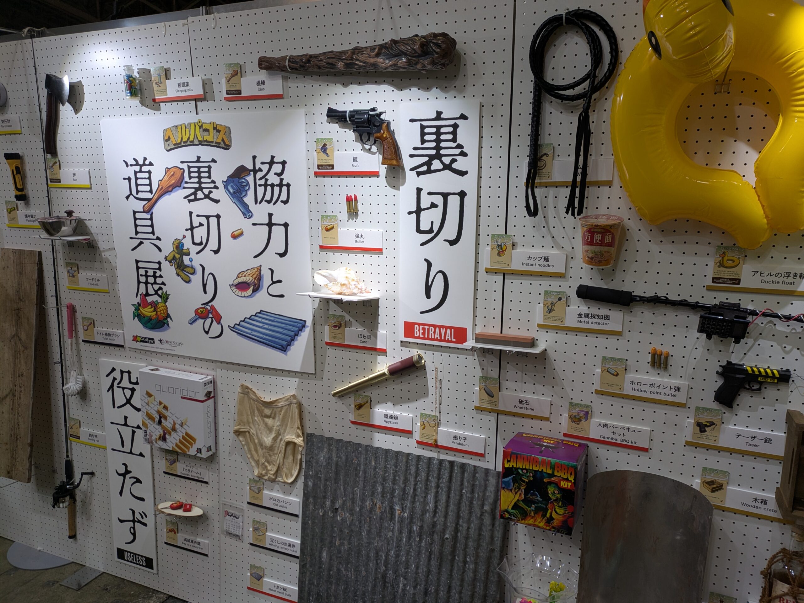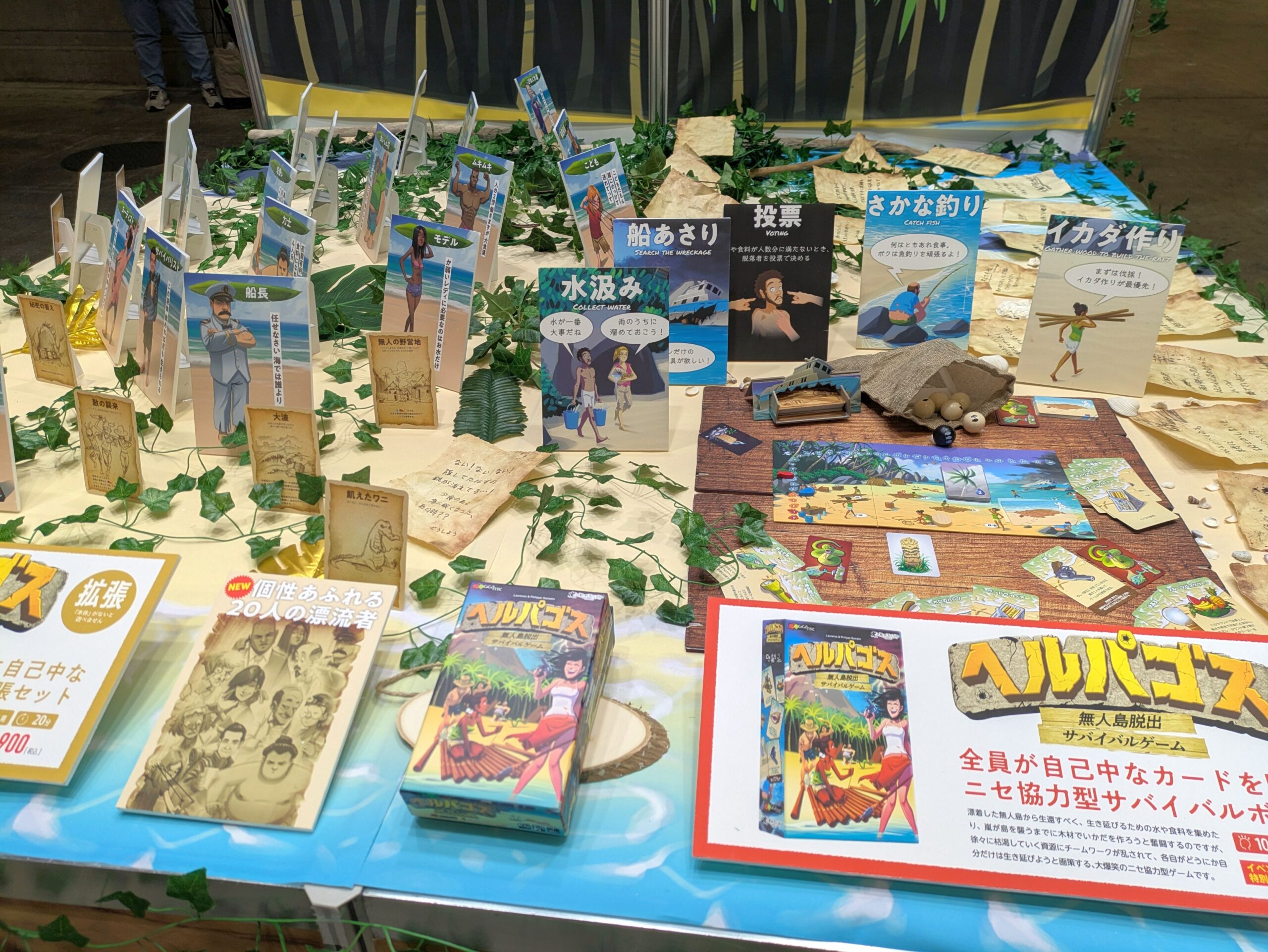 多人数でルール無用の無人島サバイバルを戦う人気作『ヘルパゴス』『ヘルパゴス拡張:島の先客と目覚めし力』をテーマとするブースを出展したすごろくや。ゲーム内に登場するキャラクターやカード、“ほぼ実物”のアイテムが展示された。