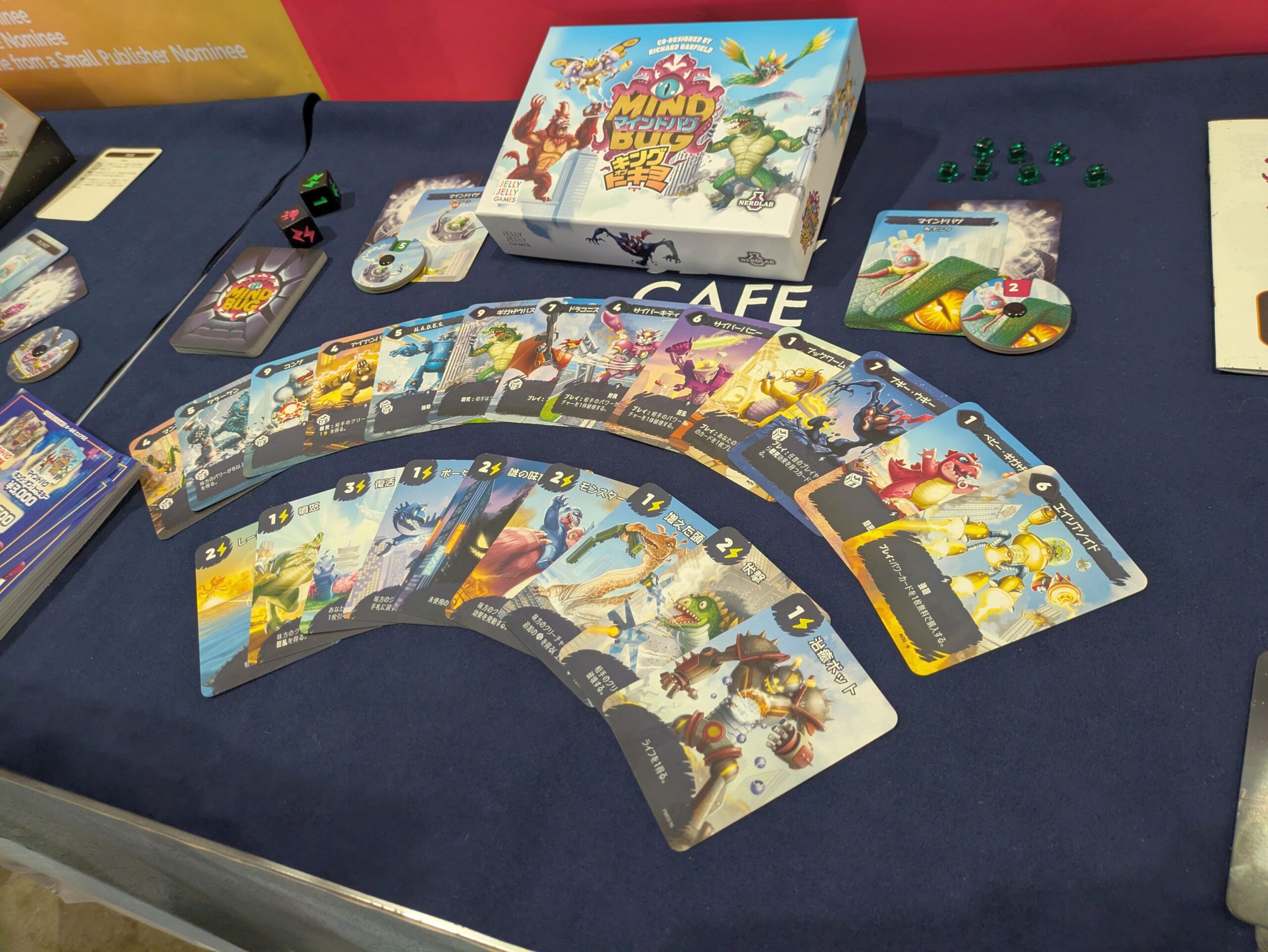 午前中、ひときわ長い行列ができたJELLYJELLYGAMES。TCGプレイヤーから熱い注目を浴びた話題の新作2人用カードゲーム『マインドバグ:最初の邂逅』と、『キング・オブ・トーキョー』とコラボした同作の拡張セット『マインドバグ:キング・オブトーキョー』が販売された。『マインドバグ:最初の邂逅』は大会も開催され、終始盛況だった。