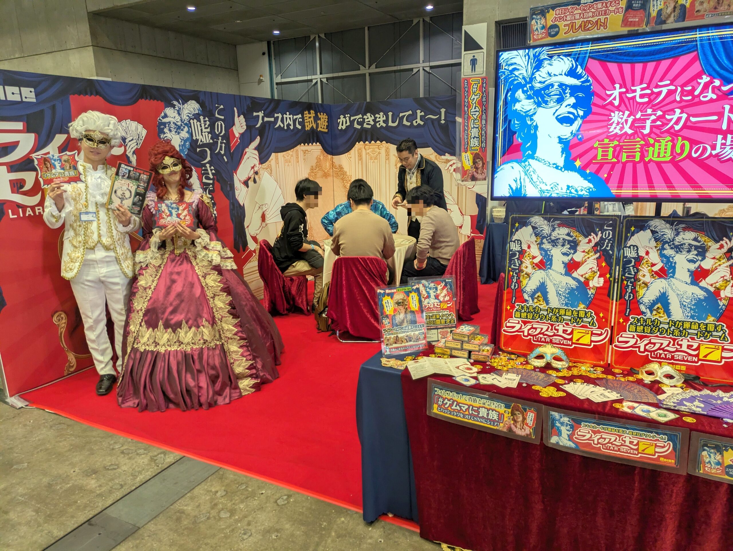 viviONのアナログゲームレーベル ADICEは、ダウト系カードゲーム『ライアーセブン』、マーダーミステリー『再起メタル祖母』の新作2タイトルを先行販売。新作の物語体験型ダークミステリー『残花 -prequel-』の先行体験も先着で開催された。ブース内には『ライアーセブン』のプロモーションを行うゴージャスな貴族の姿も……?