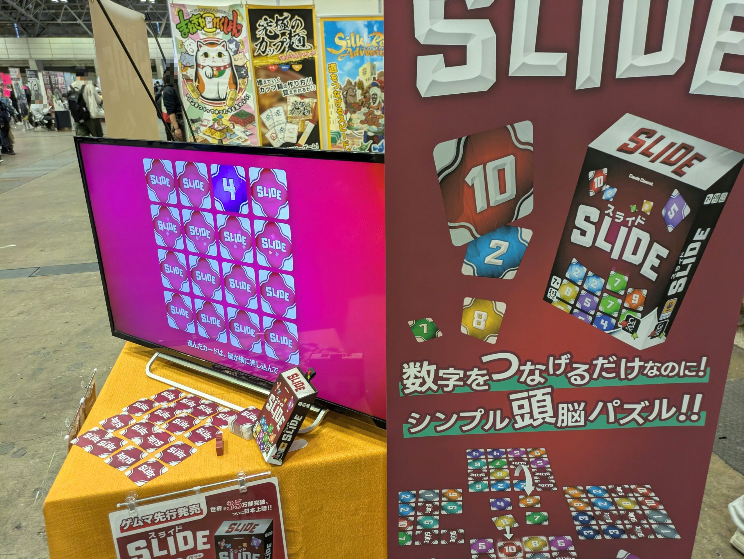 全世界35万個を販売した大ヒット作『スライド』日本版を出展。プレイヤーごとに4×4に並べた数字カードから1枚を取り、空いたスペースを埋めるようにスライドさせていくパズルゲーム。