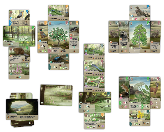 カードは森の基本となる「樹」や「低木」や湿原などの「地形」、それらの持つスペースに生息する(重ねて置く)上下もしくは左右に分割された別々の生物(「動物」、「鳥」、「昆虫」、「草」、「両生類」など)の描かれたカードがあります。