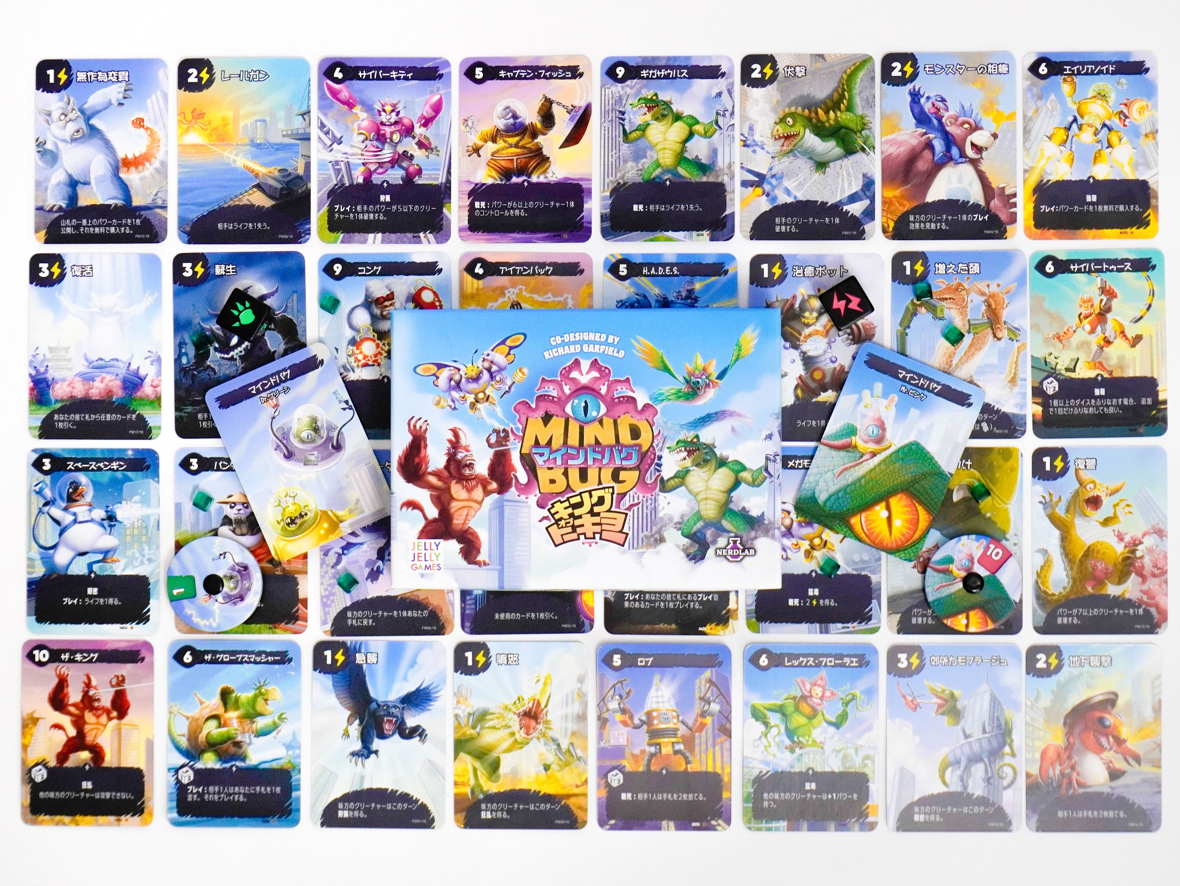 おなじみの怪獣たちが、マインドバグ特有のユニークな能力を持ってカード化。『キング・オブ・トーキョー』ファンなら思わずニヤリとする演出が随所に散りばめられています。