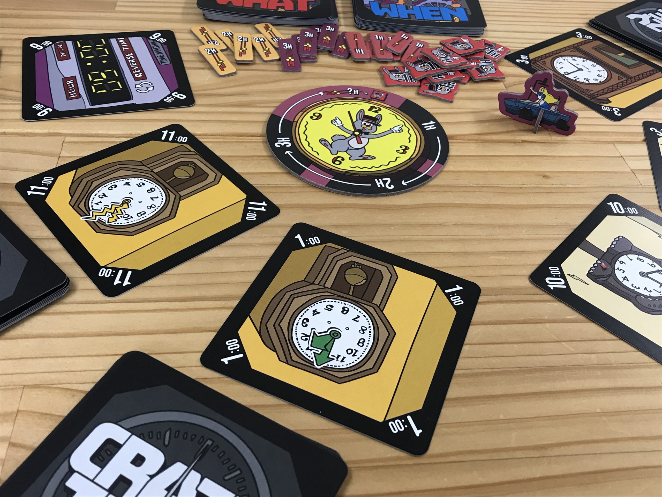 『クレイジータイム』は、時間を数えながらカードをめくり、複雑なルールに適応して正しいアクションを実行するパーティーゲームだ。めくったカードと宣言した時刻が同じになったら全員一斉に時計ボードをタッチ。デジタル時計カードでは時間を巻き戻し、複数のルールが重なれば何も起きない。混乱必至のルールの中で、ペナルティを避けながら進行していく。