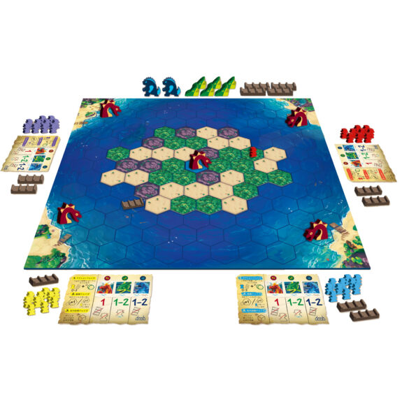 また火山島は、手番の度に標高の低いタイルから順番に取り除かれ、地形が変化していくと同時に、タイルの裏に書かれたイベントが発生します。新たな脅威や他のプレイヤーからの妨害をかわし、激しい生存競争に打ち勝ちましょう。