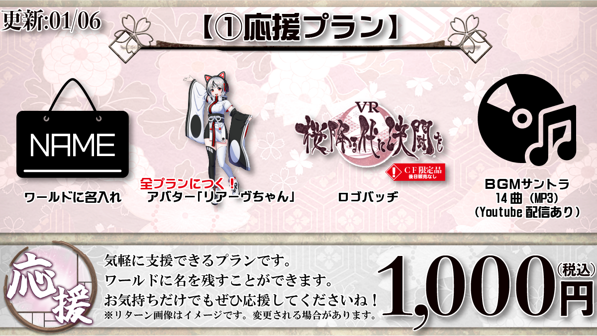 今回のクラウドファンディングは、現在オープンベータテスト中の「VR桜降る代に決闘を」ワールドを長期的に支えるための応援型支援プロジェクトとして実施します。