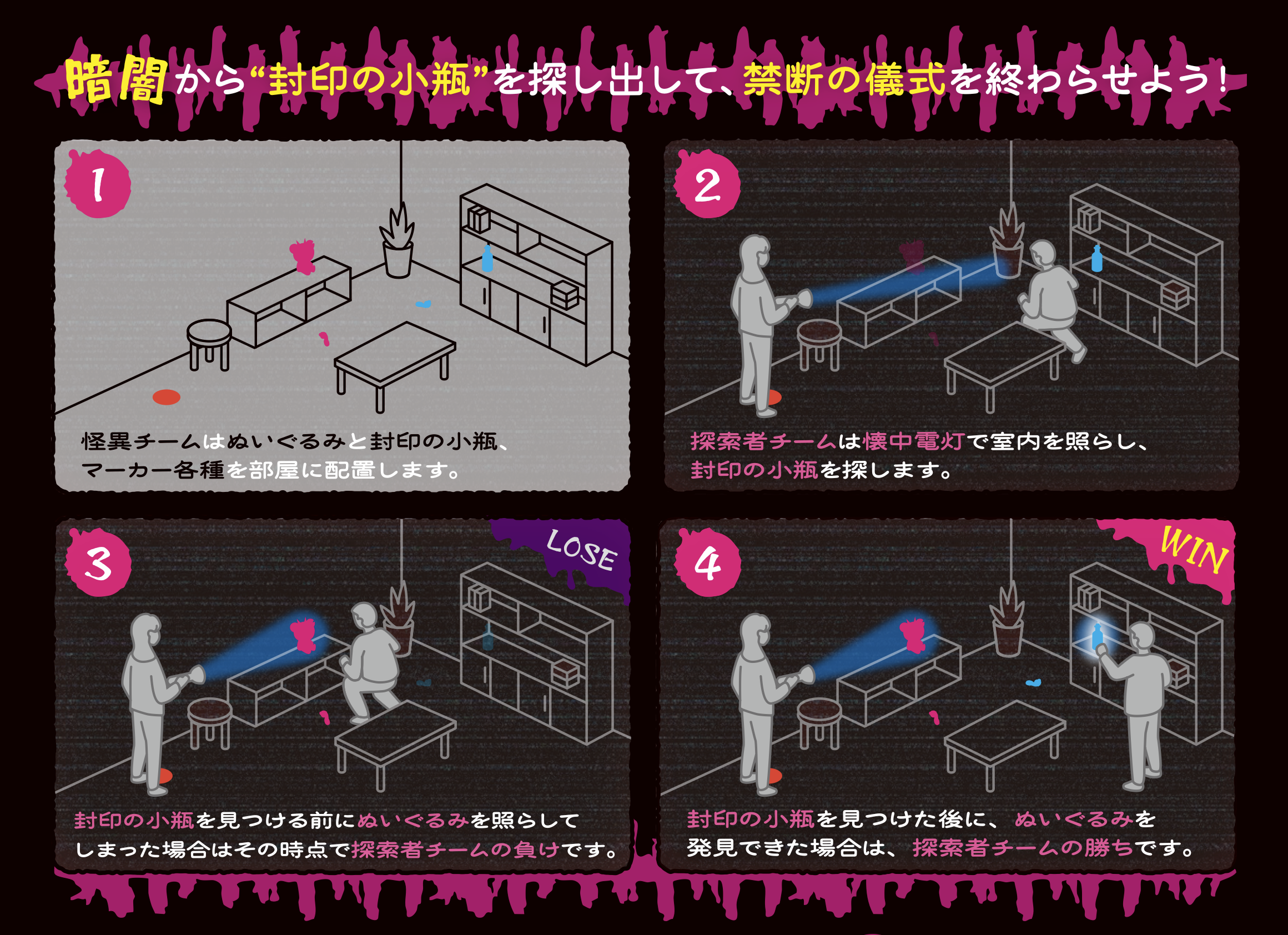 ・怪異チームは部屋のどこかに「封印の小瓶」と「ぬいぐるみ」を隠し、ヒントとなる足跡マーカーを設置します。