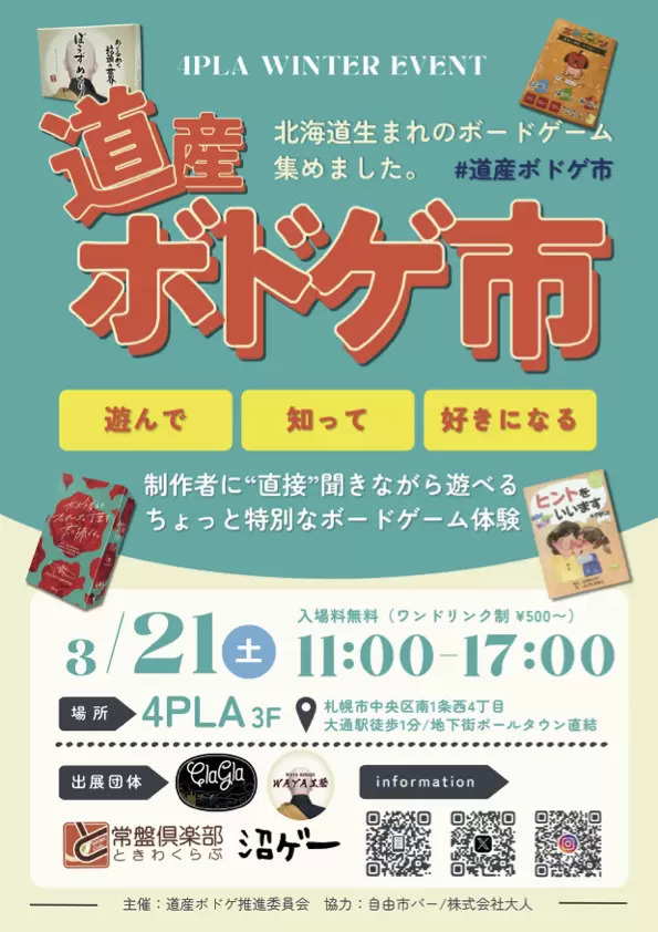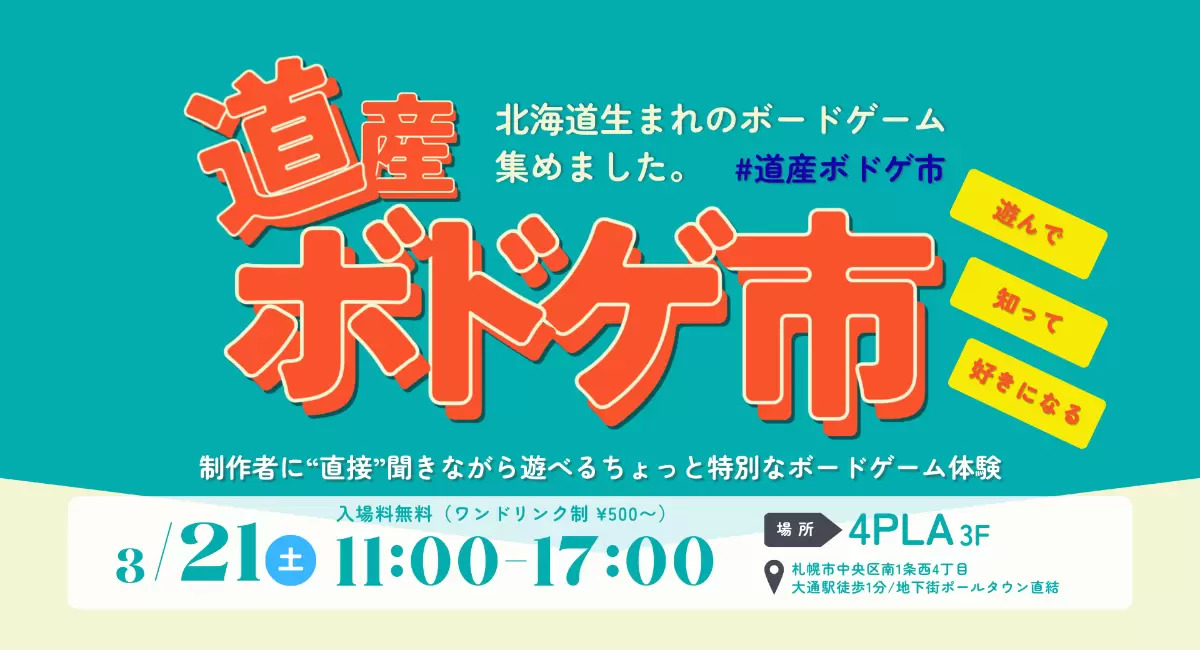 道産ボドゲ推進委員会(代表: 赤沼俊幸)は2026年3月21日(土)に札幌市中央区の商業施設「4PLA」3階にて、北海道在住のクリエイターが制作したボードゲームを一堂に集めた試遊・販売イベント「道産ボドゲ市」を初開催いたします。本イベントは北海道で活動するボードゲーム制作者4団体が出展し、来場者が制作者から直接ルールを教わりながらゲームを体験できる、「試遊メイン」の北海道初の試みです。入場無料(ワンドリンク制)で、お子さま(4歳以上)から大人まで、ボードゲーム初心者でも気軽に楽しめるイベントとなっています。